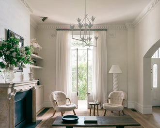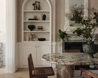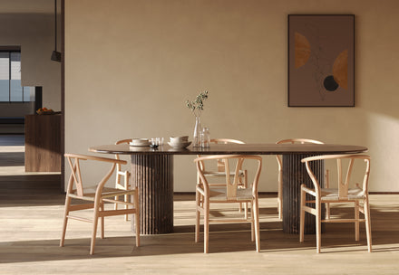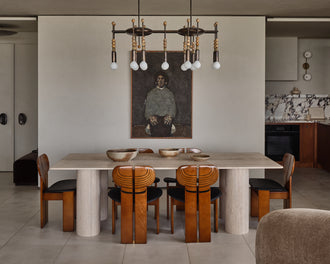 A sculptural table and crafted chairs equally suited for hosting slow mornings or long evening events.