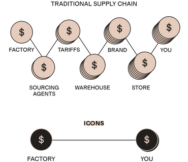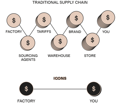 We bring you iconic, design-driven pieces crafted with integrity, at a fraction of traditional designer prices. By eliminating unnecessary layers in the supply chain, we ship directly from our ethical factories to your home, reducing costs and minimizing environmental impact. The ICONS model redefines how timeless design reaches you, sustainably and transparently.