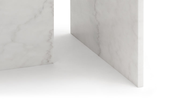 Boasting a functional 35” round top and luxurious polished white marble finish, practicality and style coalesce perfectly in the design of the Olivia coffee table. The elegant round top is counterbalanced visually by the angular base, coming together for a design which is minimalistic in principle yet undeniably striking. Its unfussy form and sleek silhouette emphasizes the materiality of the stone: the depth, luster, and subtle, characterful veining which make marble so sought-after. As such, every Olivia coffee table will be one-of-a-kind, exhibiting the unique characteristics that have been rendered into the stone over hundreds of years; please expect subtle variations in colour, texture, and veining.