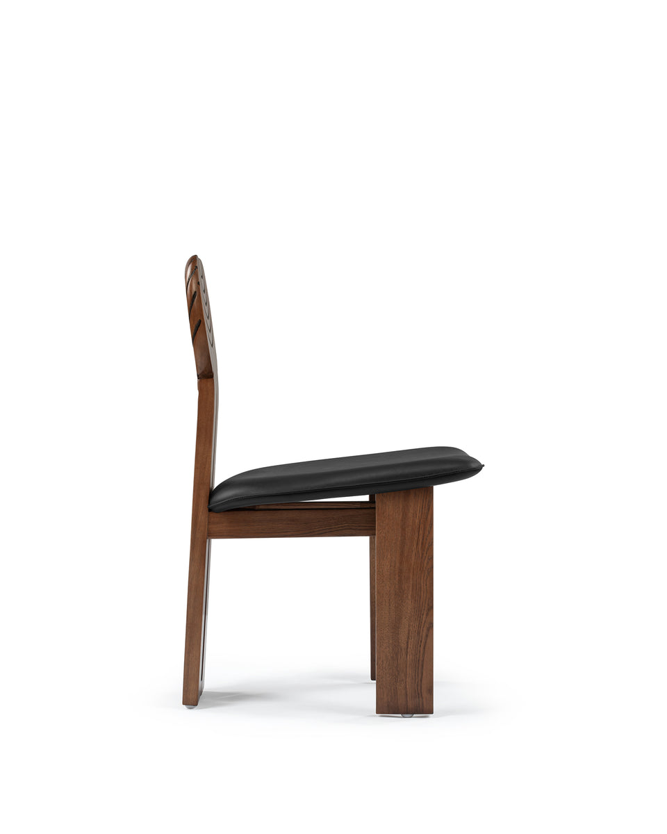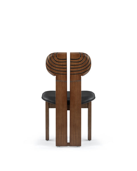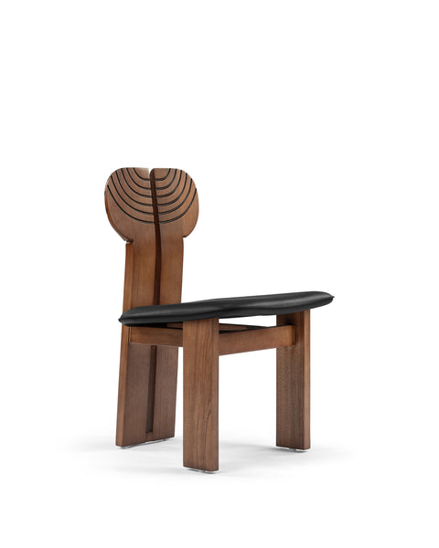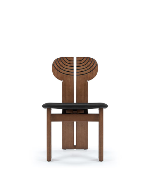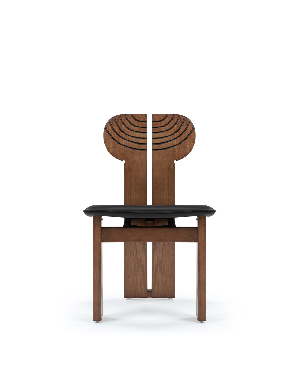 The Africa Chair is a sophisticated piece of furniture that blends comfort with artistry. Upholstered in black leather, the seat ensures a luxurious and cozy sitting experience, while the solid ash wood frame, finished in a warm walnut stain, adds durability and visual appeal. Its distinctively designed backrest, split into two sections with black curved inlay lines, introduces a contemporary yet timeless aesthetic.