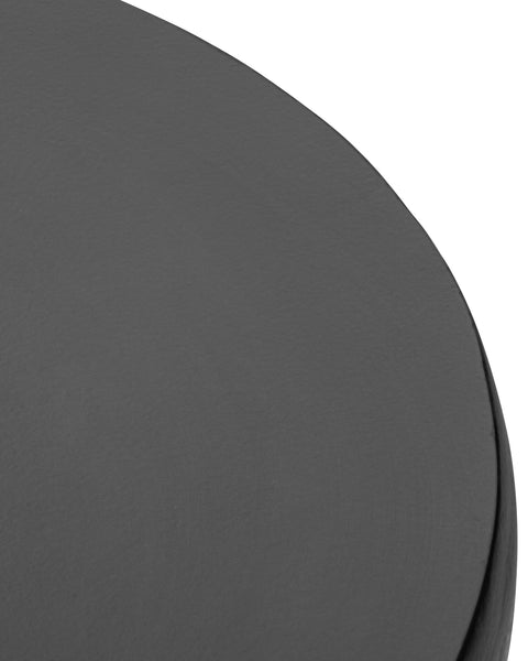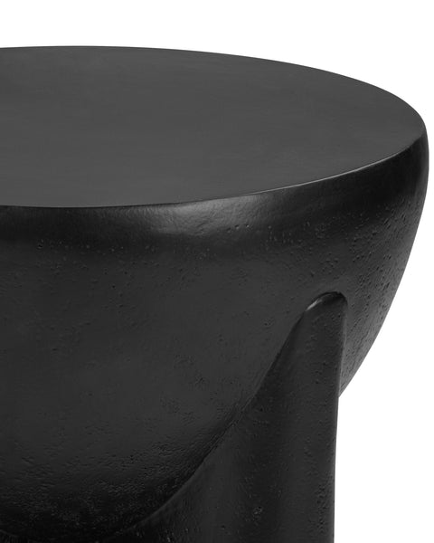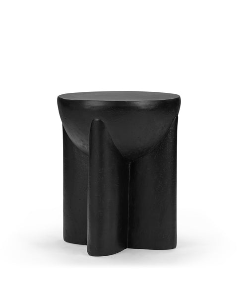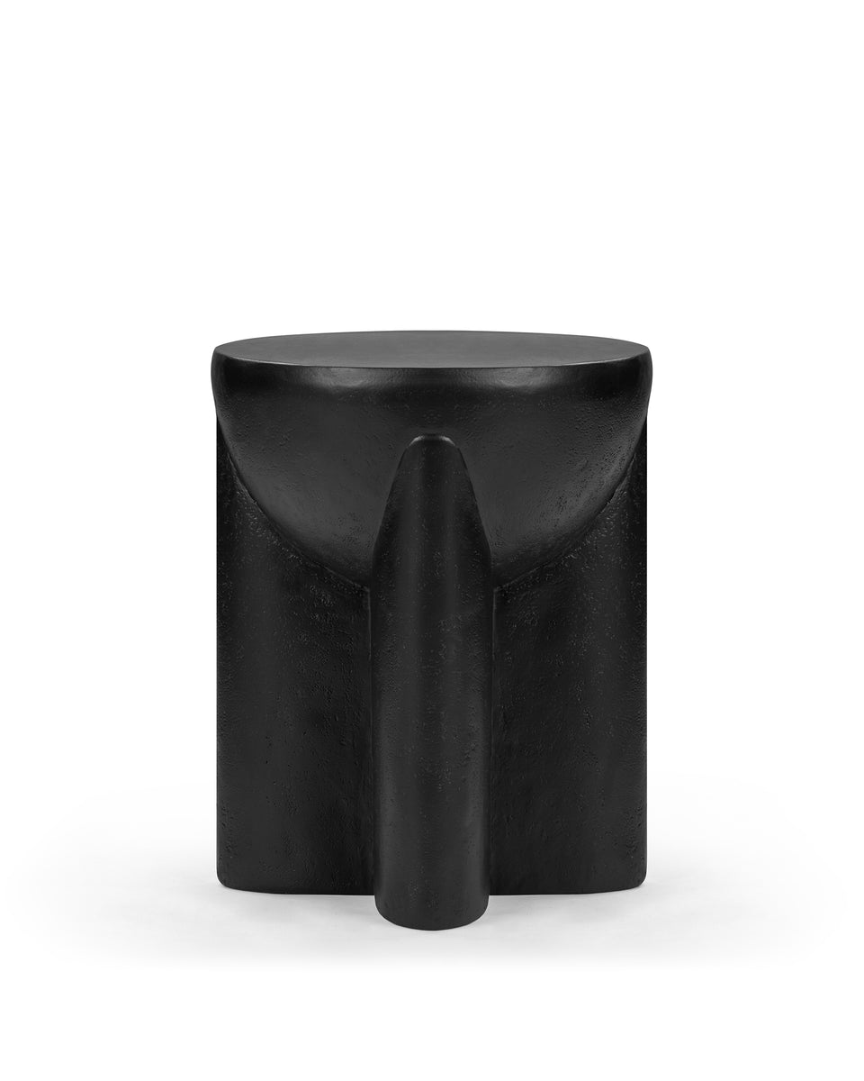 The Alto Side Table combines modern sculptural aesthetics with practical design. Crafted from black concrete, it features a unique cylindrical form with integrated vertical supports that seamlessly merge into a flat, circular tabletop. Its matte black finish with a textured surface enhances the table's depth and minimalist yet bold visual appeal.