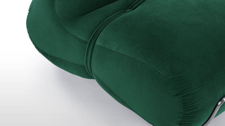 The Bao Lounge Chair features a low-maintenance velvet in a rich, vibrant green color, supported by a metal frame in a gunmetal gray finish. Its design includes buttoned upholstery, with a thick piping detail repeated across the back and seat cushions. The sumptuous curved profile enhance its comfort and style, offering generous seating in an eye-catching form.
