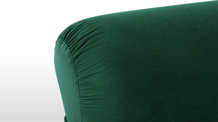 The Bao Lounge Chair features a low-maintenance velvet in a deep green, contrasted by a gunmetal gray metal frame. The design is defined by the thick piping detail across the back and seat cushions.