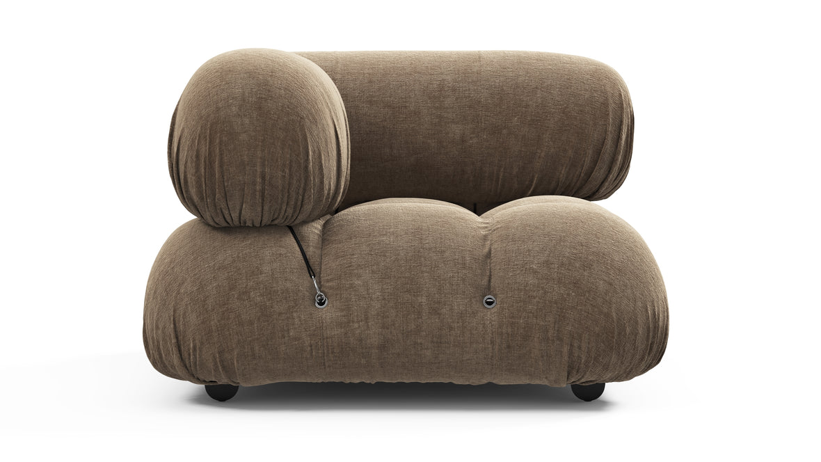- Modular Instructions : Each section of the Mario Bellini Sofa is modular and is attached with string ties and carabiners. To assemble or rearrange your sofa, simply unclip the carabiners from one ring and attach to a corresponding ring on the module you wish to connect to.