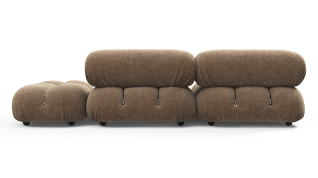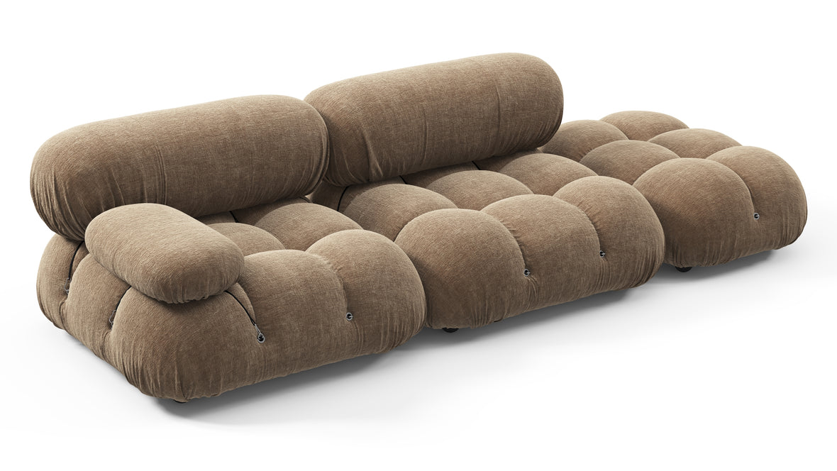 - Modular Instructions : Each section of the Mario Bellini Sofa is modular and is attached with string ties and carabiners. To assemble or rearrange your sofa, simply unclip the carabiners from one ring and attach to a corresponding ring on the module you wish to connect to.