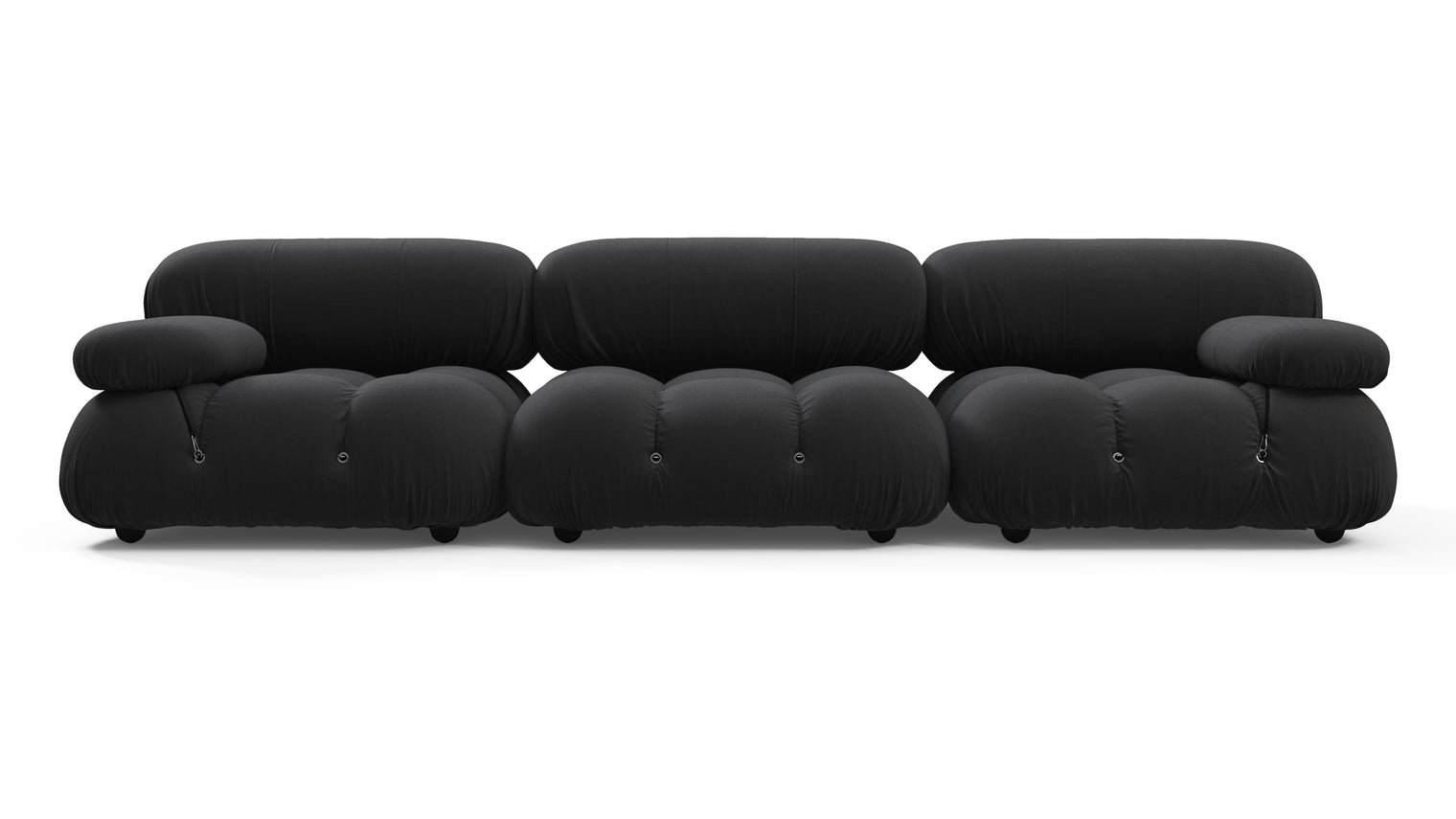 - Modular Instructions : Each section of the Mario Bellini Sofa is modular and is attached with string ties and carabiners. To assemble or rearrange your sofa, simply unclip the carabiners from one ring and attach to a corresponding ring on the module you wish to connect to.