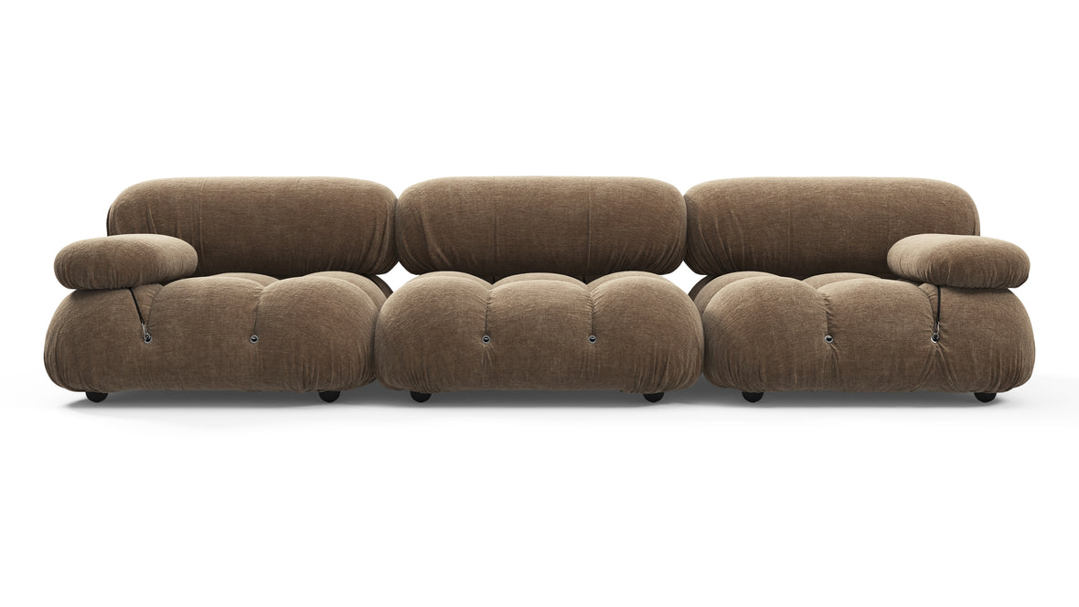 - Modular Instructions : Each section of the Mario Bellini Sofa is modular and is attached with string ties and carabiners. To assemble or rearrange your sofa, simply unclip the carabiners from one ring and attach to a corresponding ring on the module you wish to connect to.