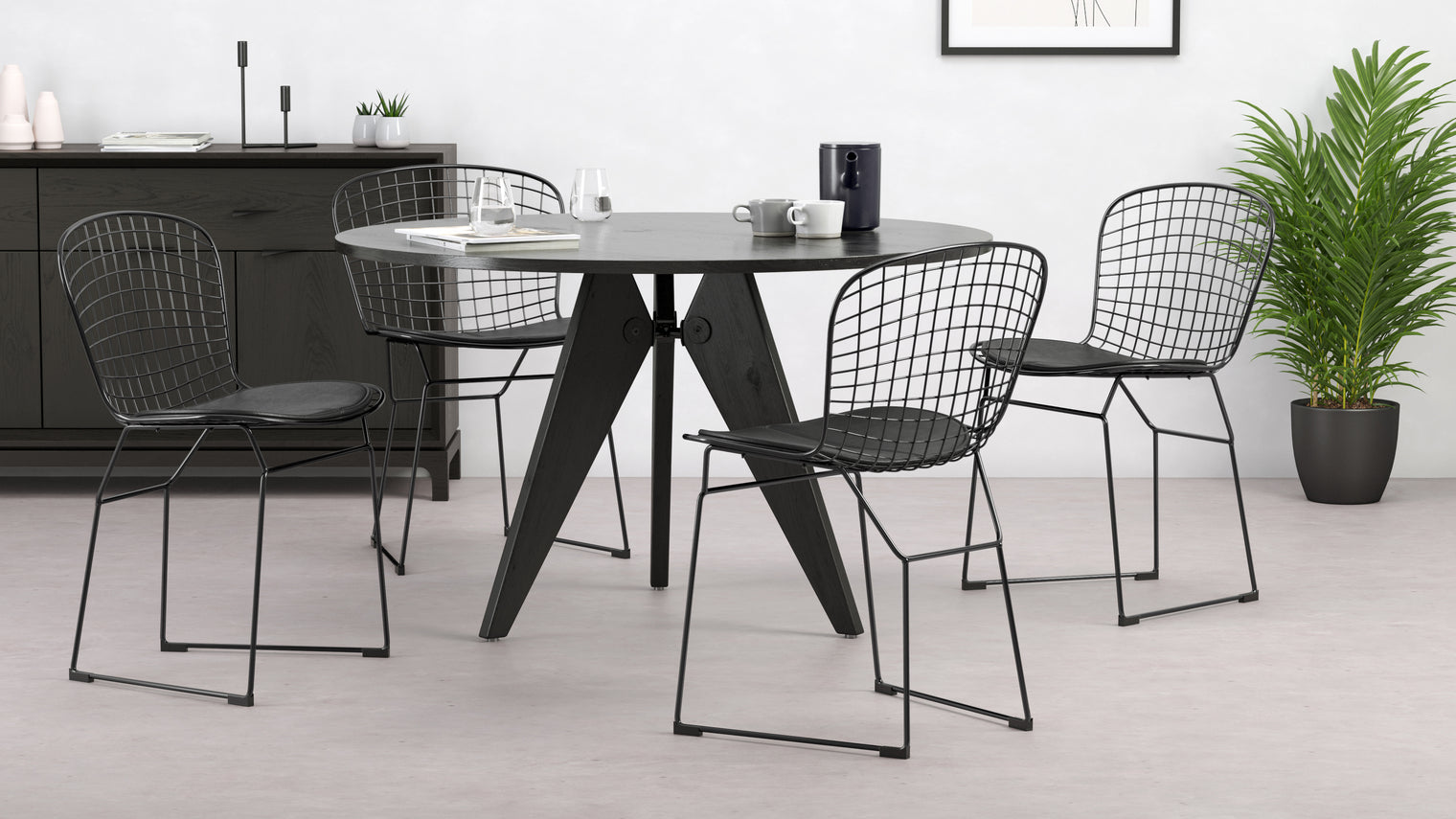 Precision-welded of steel wire with a classic leather seat pad, this chair is beloved for its fusion of engineering acumen and everyday comfort.