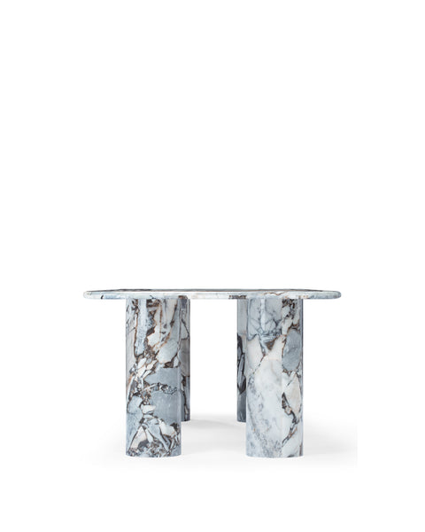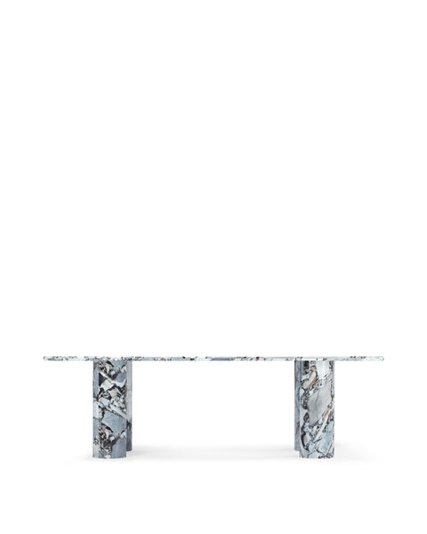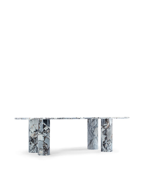 Quad-Pillar Support System: Four massive cylindrical marble legs engineered to provide maximum structural stability and a bold footprint.
