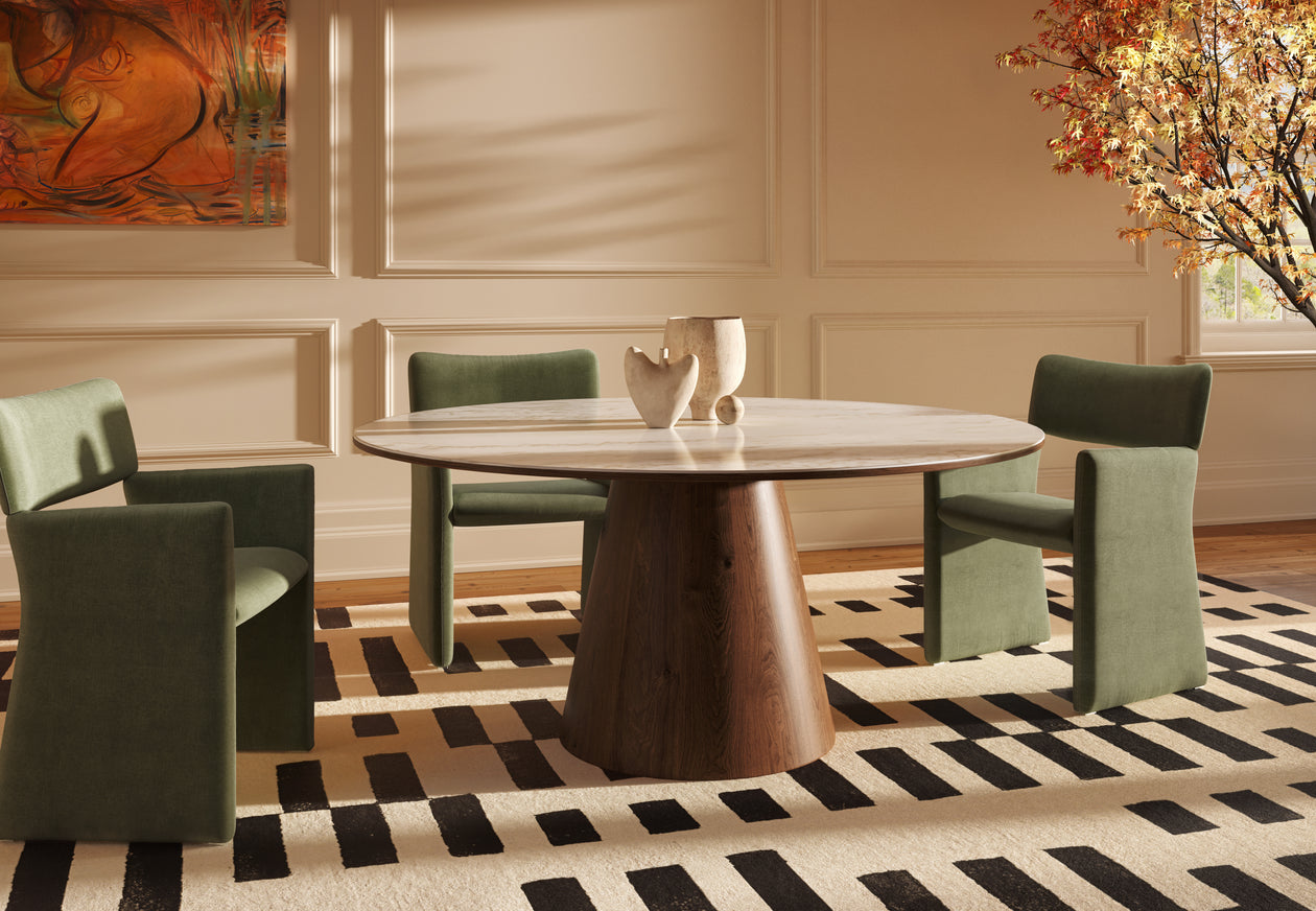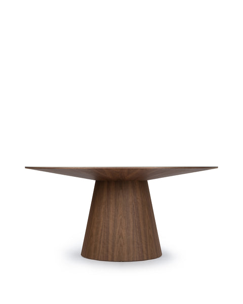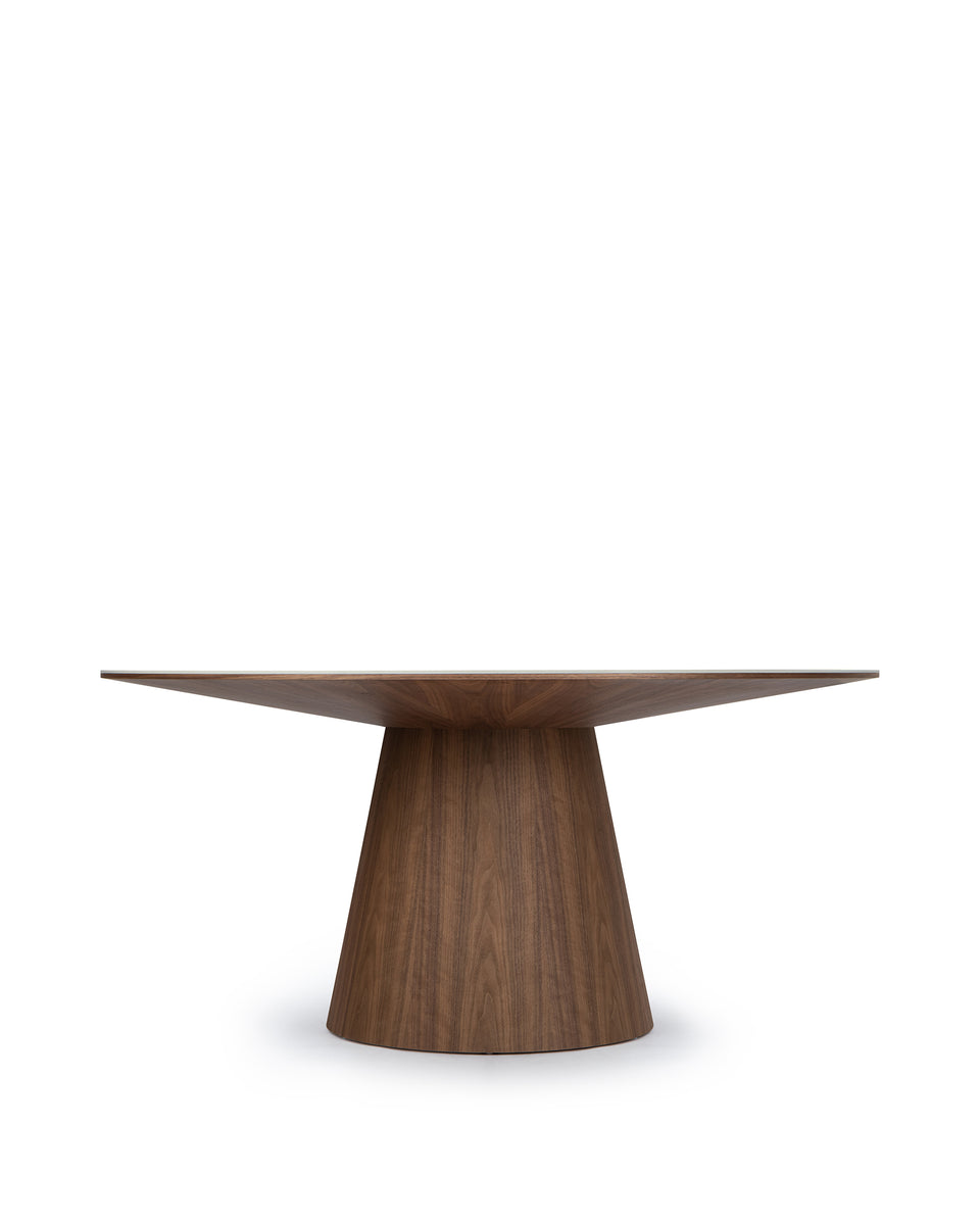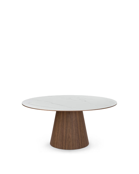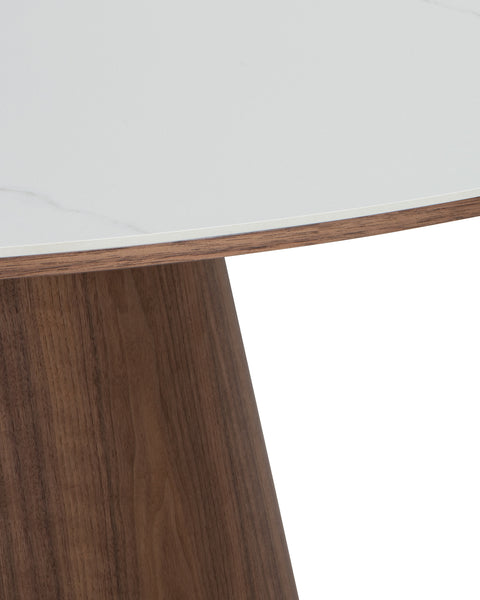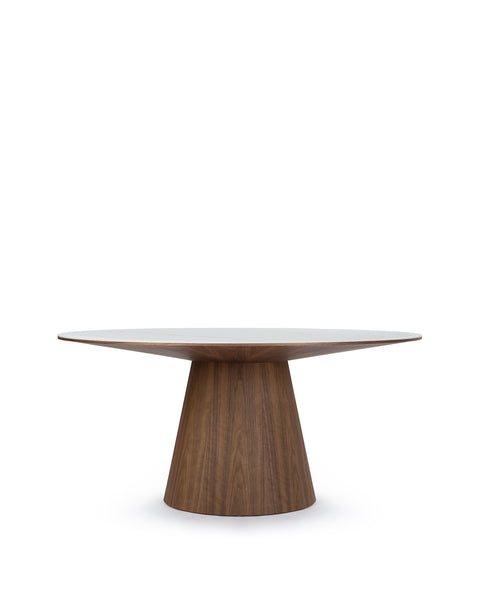 The Cella Dining Table features a striking pedestal design, with a narrow neck that elegantly flares beneath the tabletop, creating a visually lightweight surface supported by a sturdy base. This unique structure is complemented by two material options for the tabletop: ceramic or white translucent glass, both beautifully paired with a rich walnut base with a natural grain pattern, accentuating its sophisticated form.