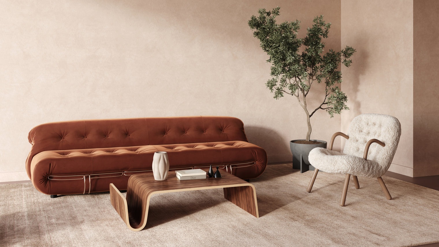 Playfully named because of its resemblance to a shell, the Clam chair’s simple, playful form pays homage to Scandinavian design in its honest, understated use of European hardwood and plush upholstery.