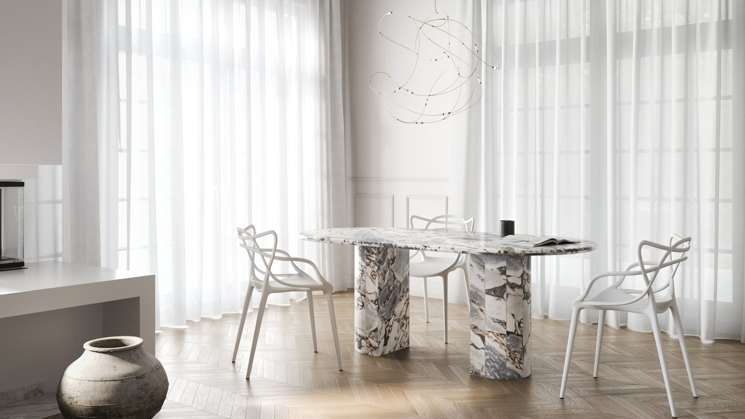 Coated in Italian modellato marble from top to bottom, the Dante dining table is the ultimate statement piece. A reimagining of the classic double pedestal table, this luxurious piece is designed to elevate contemporary, luxe interiors.