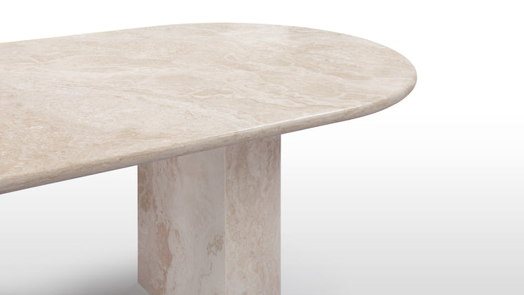 A gorgeous centerpiece for any dining space, the Dante dining table is the epitome of fine dining. Visually striking yet un-fussy, its minimal form compliments and accentuates the luxurious Italian travertine. Designed with a polished finish, the Dante dining table is the ultimate statement piece for dining and hosting. The accommodating 77” top is supported by two demi-lune column legs, which draw on the grandeur of classical architecture whilst retaining a fresh, contemporary feel.
