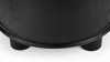 The Farro Coffee Table features a matte black finish with wood grain detailing, creating a bold and dark appearance. Its circular top has a rounded lip on the edge, and the table stands on asymmetrically sized tubular legs, with one leg wider than the others. The chunky proportions and rounded shapes contribute to its fun design, and adds a visual softness to your interior.