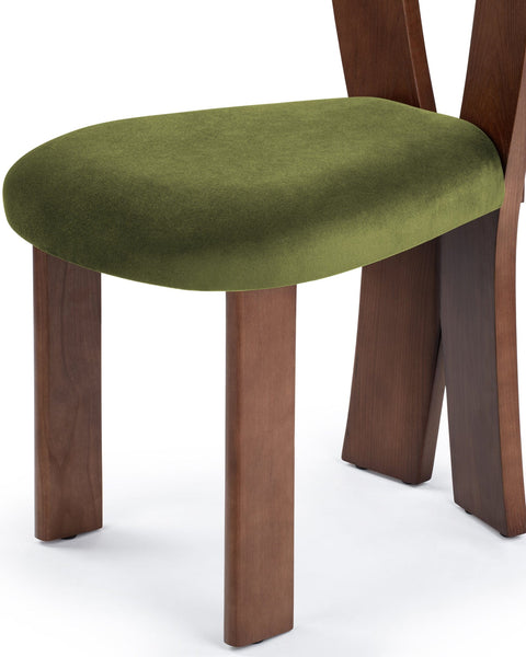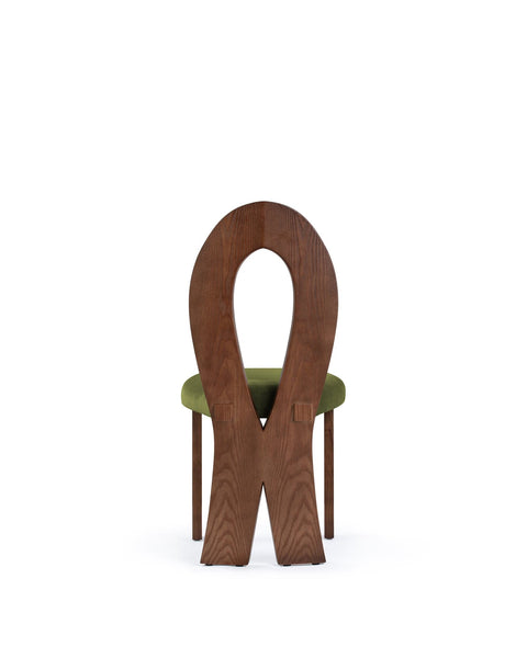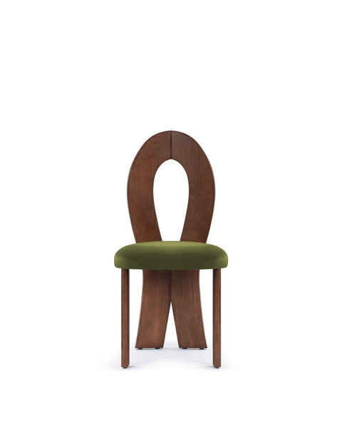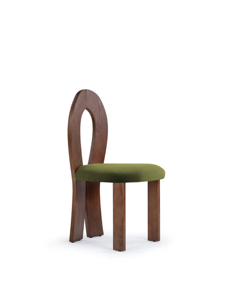 The Fin Chair is a blend of modern artistry and mid-century elegance. Its loop-shaped backrest, made of solid wood with a rich dark finish, brings a sculptural and minimalist aesthetic while showcasing the natural wood grain. The soft green velvet upholstered seat adds comfort and a fresh pop of color, complementing the chair’s organic wooden elements. With sturdy rectangular legs crafted from matching wood, the design offers both cohesion and stability.