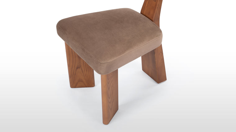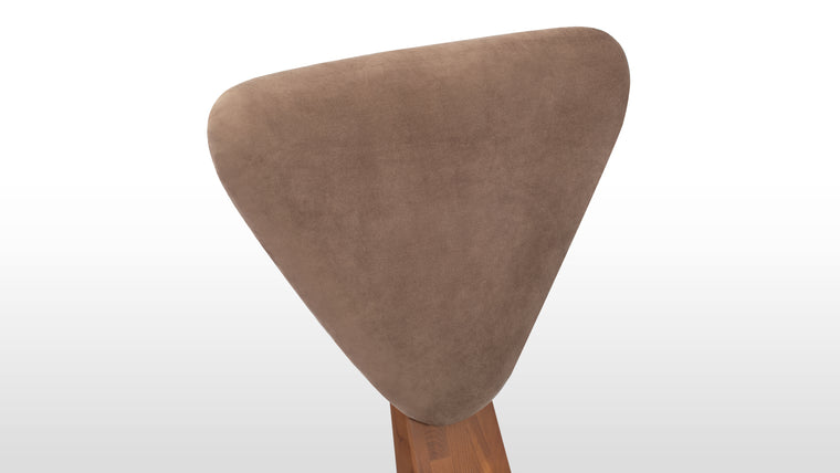The Giraffe Dining Chair is a modern, minimalist seating solution crafted with a sturdy walnut wood frame and plush velvet upholstery. Its unique geometric design features a triangular seat with softly rounded edges and an inverted triangular backrest, offering a striking yet comfortable aesthetic. The warm brown velvet enhances its sophisticated appeal, making it a stylish addition to contemporary interiors.
