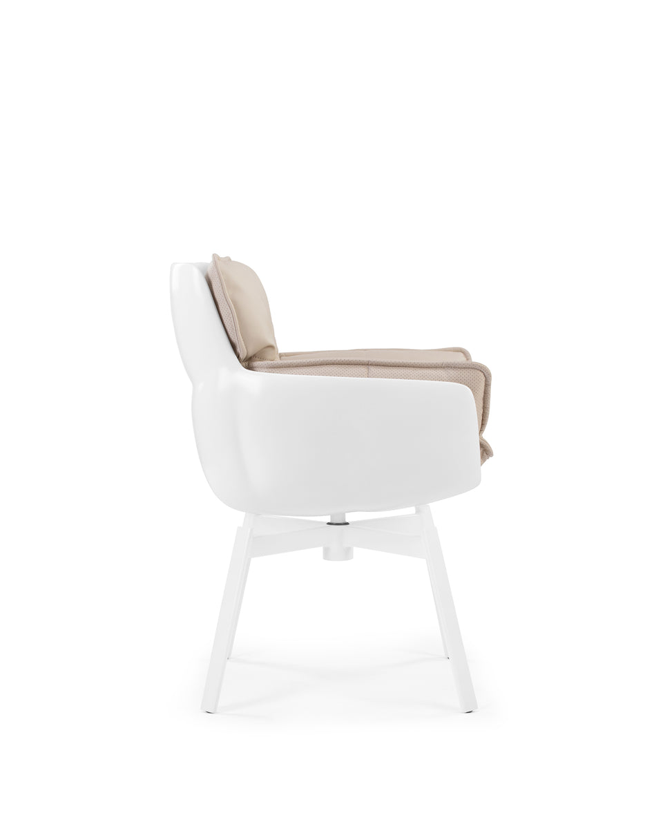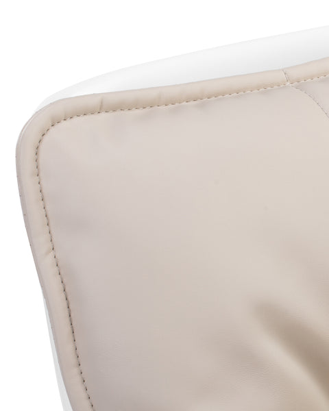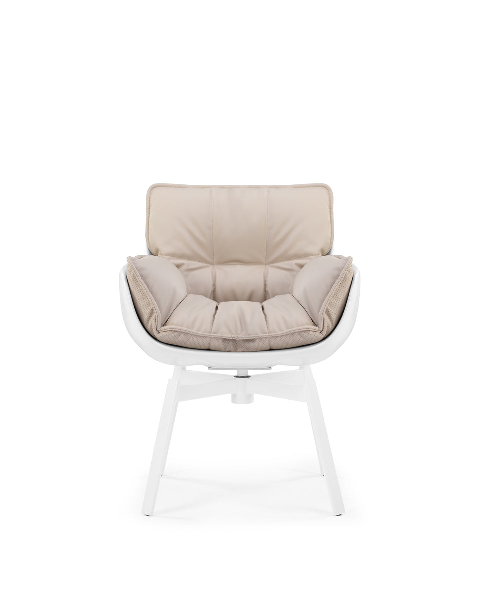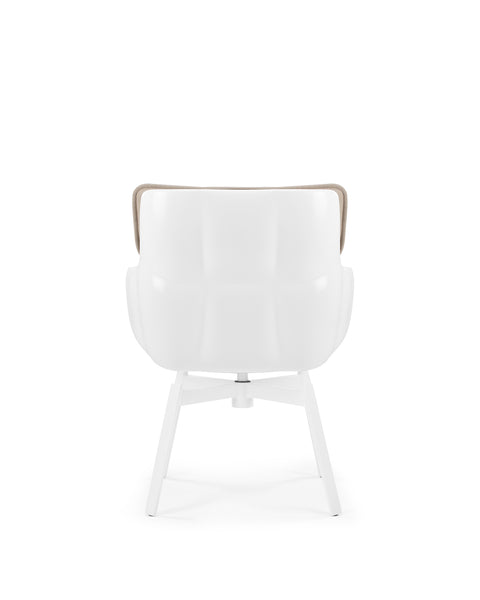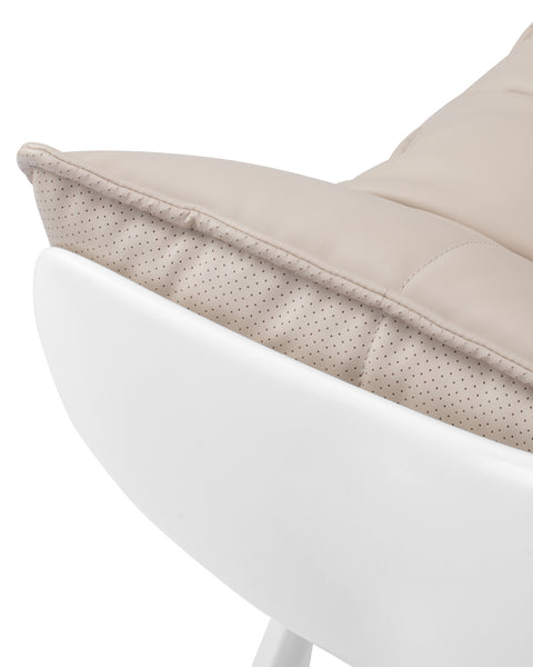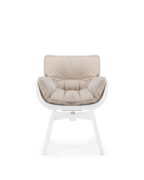 The Husk Armchair exudes a unique design that combines both comfort and modern sophistication. Upholstered in warm, mid-tone grey vegan leather, padded foam compartments separated by meticulous stitch-work create an inviting cocoon-like feel that gently embraces your body. The chair's fibreglass shell is thoughtfully molded to the body's contours for ergonomic support, sitting atop a splayed leg base that adds to its contemporary aesthetic.