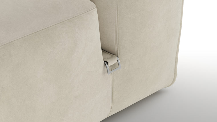 Available in both neutral-toned fabric and leather or vegan suede, the collection features a foam interior for deep comfort, with understated wooden legs and sleek metal buckles for easy configuration.