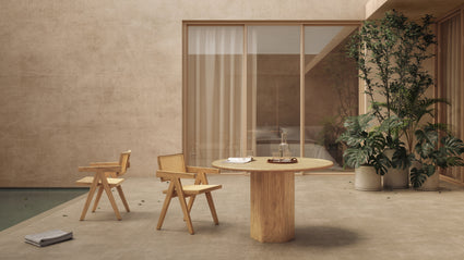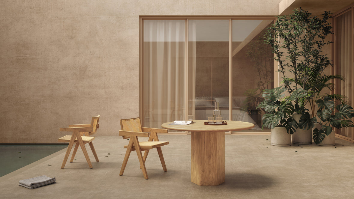 Crafted from solid teak wood, the Lotus Dining Table is built for durability and resilience against outdoor elements, making it an excellent choice for patios, terraces, and gardens. The round tabletop showcases a plank-style wood grain, adding a rustic yet refined aesthetic, while the sturdy pedestal base ensures stability and a sleek, minimalistic appeal. Available in a natural finish for a raw, organic look or a walnut stain for a more sophisticated touch, this table seamlessly blends with various outdoor décors.