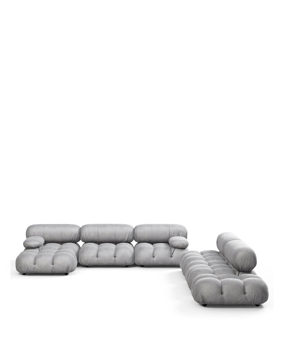 | Modular Instructions | Each section of the Mario Bellini Sofa is modular and is attached with string ties and carabiners. To assemble or rearrange your sofa, simply unclip the carabiners from one ring and attach to a corresponding ring on the module you wish to connect to. |