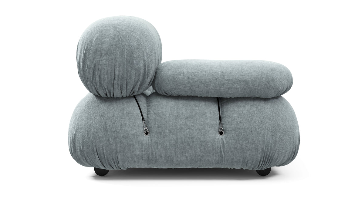- Modular Instructions : Each section of the Mario Bellini Sofa is modular and is attached with string ties and carabiners. To assemble or rearrange your sofa, simply unclip the carabiners from one ring and attach to a corresponding ring on the module you wish to connect to.