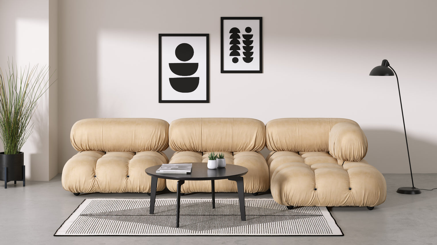 - Modular Instructions : Each section of the Mario Bellini Sofa is modular and is attached with string ties and carabiners. To assemble or rearrange your sofa, simply unclip the carabiners from one ring and attach to a corresponding ring on the module you wish to connect to.