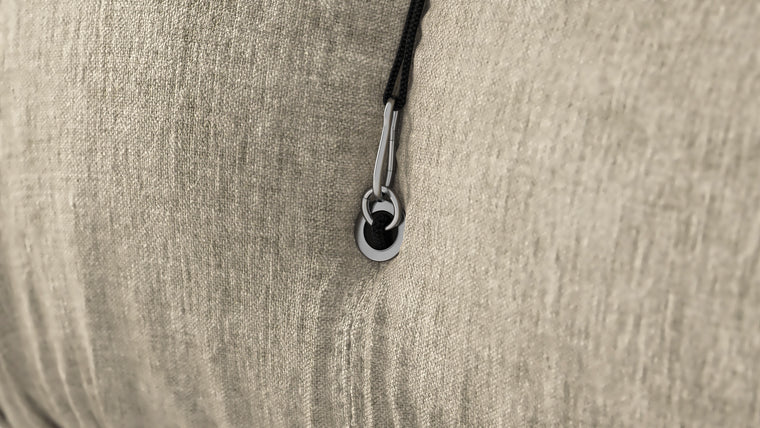 - Modular Instructions : Each section of the Mario Bellini Sofa is modular and is attached with string ties and carabiners. To assemble or rearrange your sofa, simply unclip the carabiners from one ring and attach to a corresponding ring on the module you wish to connect to.