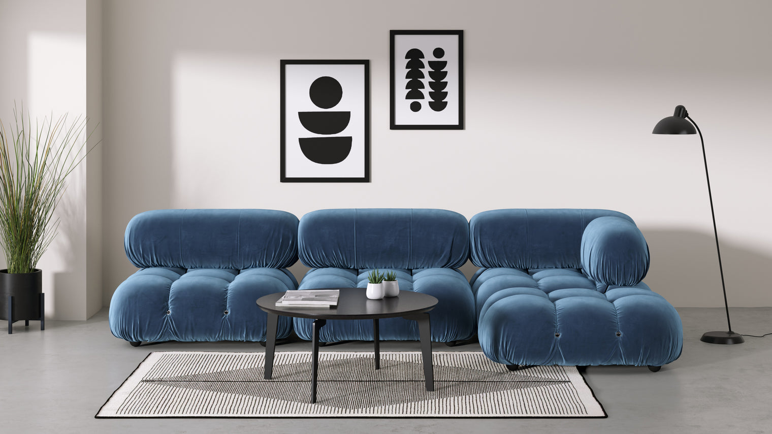 - Modular Instructions : Each section of the Mario Bellini Sofa is modular and is attached with string ties and carabiners. To assemble or rearrange your sofa, simply unclip the carabiners from one ring and attach to a corresponding ring on the module you wish to connect to.