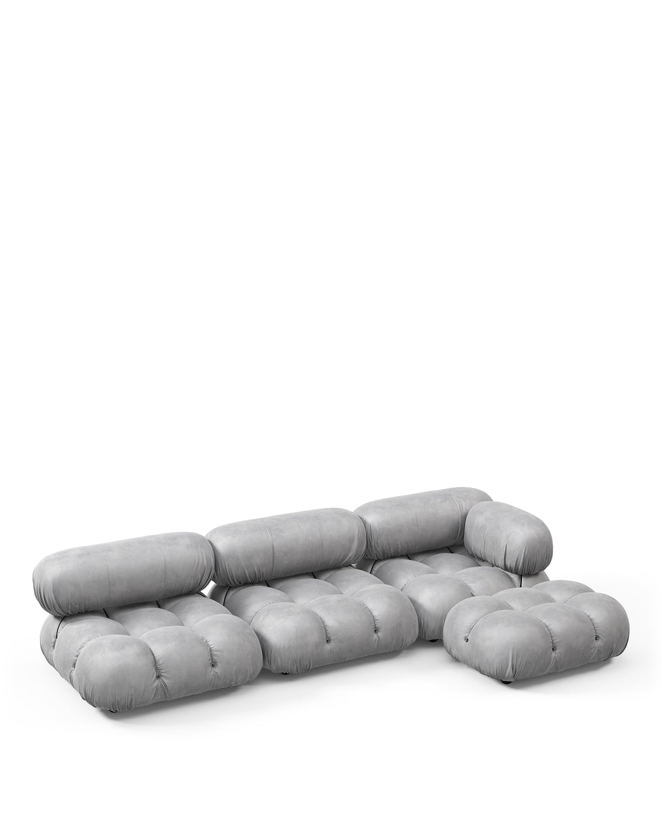| Modular Instructions | Each section of the Mario Bellini Sofa is modular and is attached with string ties and carabiners. To assemble or rearrange your sofa, simply unclip the carabiners from one ring and attach to a corresponding ring on the module you wish to connect to. |