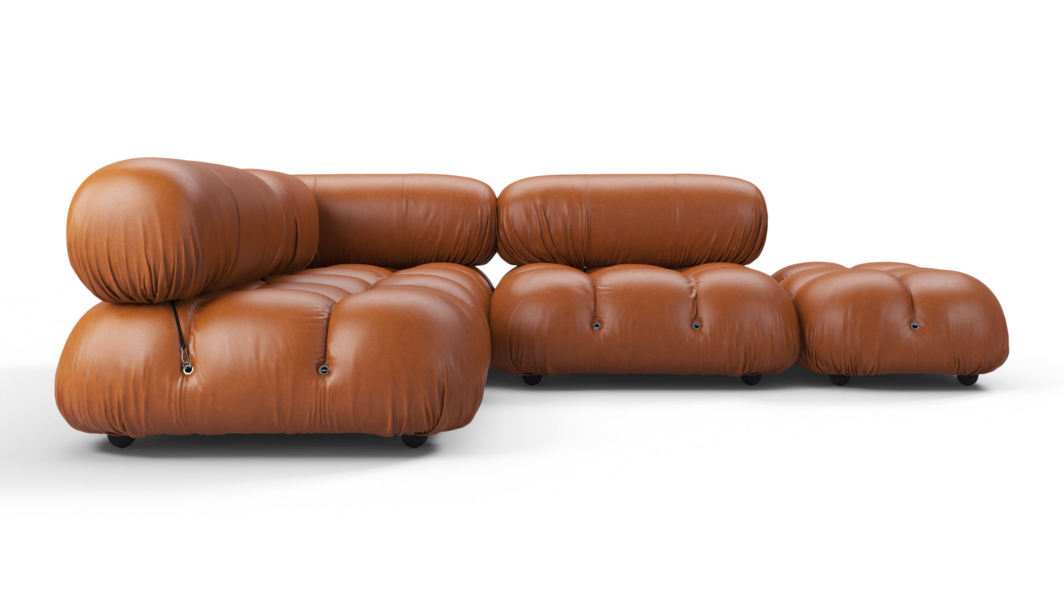 - Modular Instructions : Each section of the Mario Bellini Sofa is modular and is attached with string ties and carabiners. To assemble or rearrange your sofa, simply unclip the carabiners from one ring and attach to a corresponding ring on the module you wish to connect to.