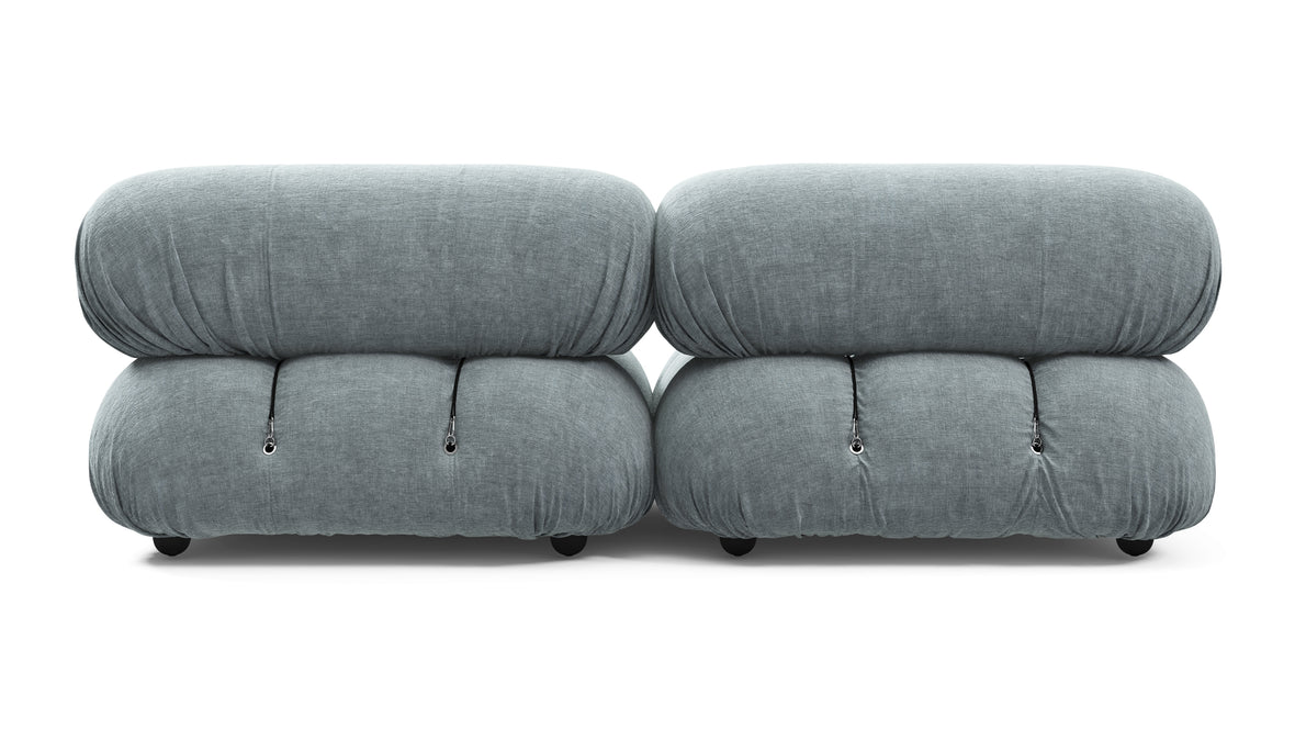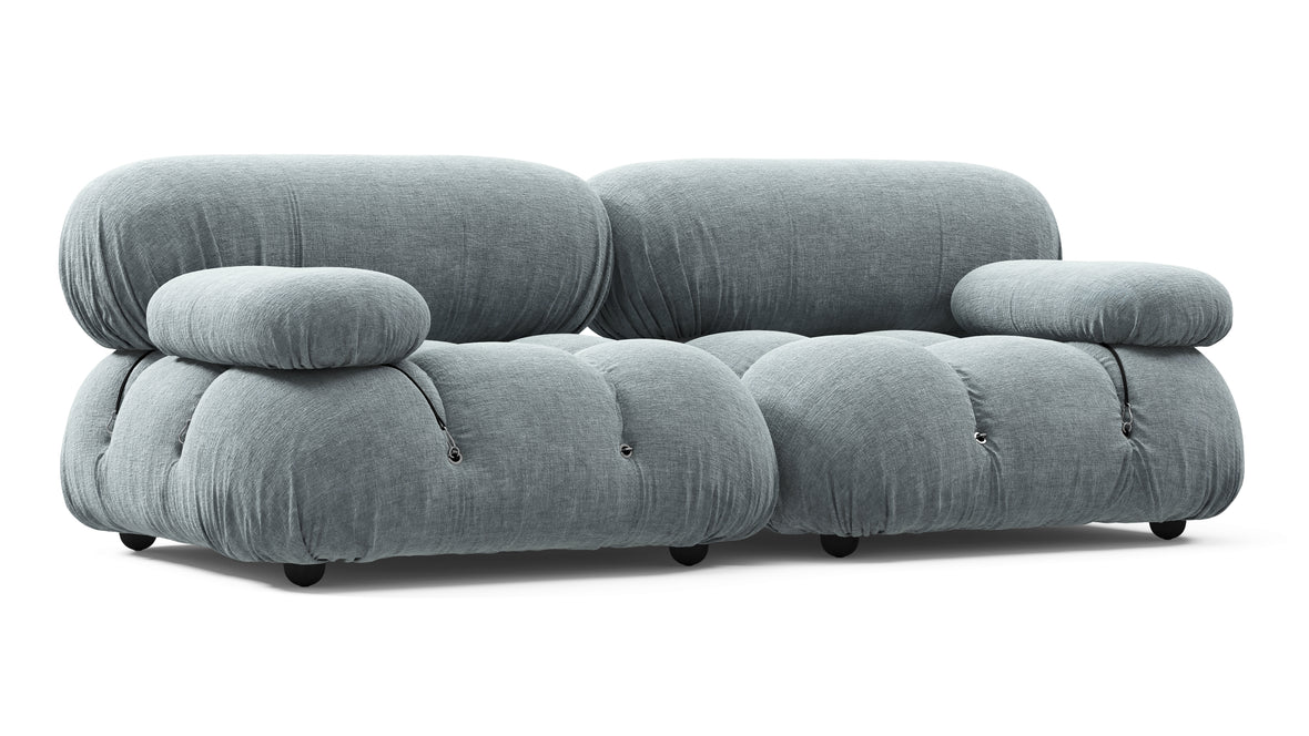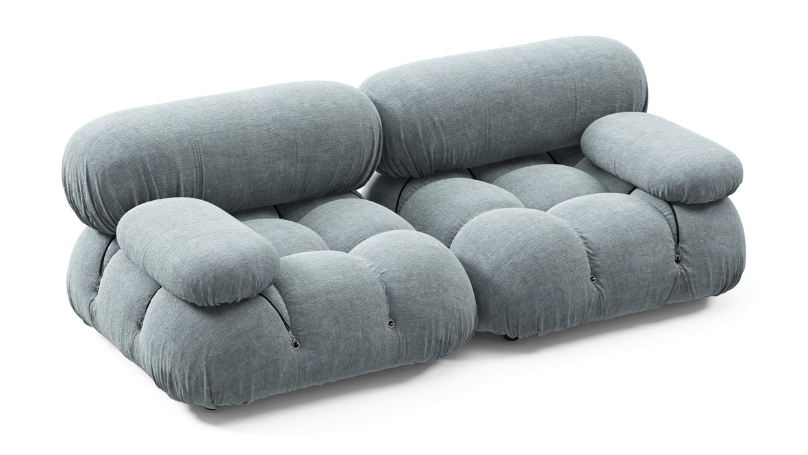 - Modular Instructions : Each section of the Mario Bellini Sofa is modular and is attached with string ties and carabiners. To assemble or rearrange your sofa, simply unclip the carabiners from one ring and attach to a corresponding ring on the module you wish to connect to.