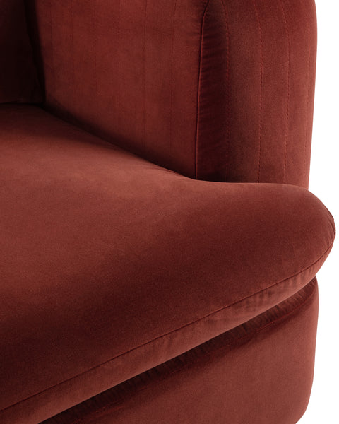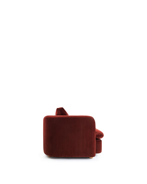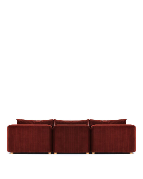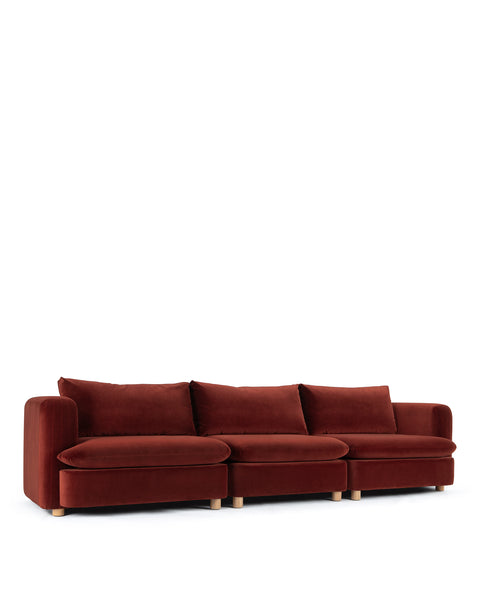 The Morrell sectional collection offers a luxurious blend of traditional design with contemporary details, making it a standout piece for any living space. Upholstered in rich red velvet, the sofa modules showcase modern stitch-work lines along the arms and back panels, adding a touch of sophistication to an otherwise traditional design. Its neat wooden legs elevate the unit, introducing a sense of lightness, while the soft, low-maintenance cushions provide ultimate comfort for the whole family.