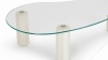 Wide legs paired with a thin glass surface, ensuring both functionality and style. The wave-like shapes and rounded edges to the tabletop contrast with its sturdy, commanding legs.