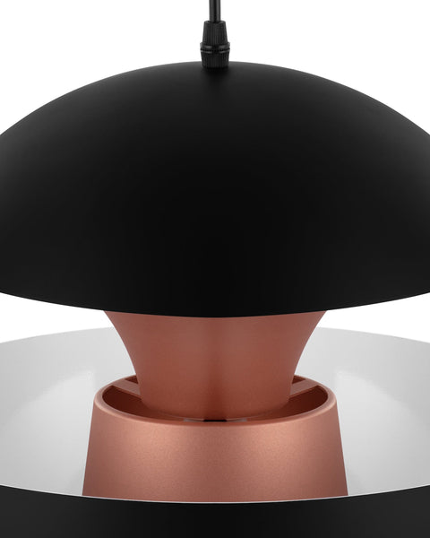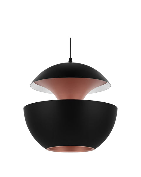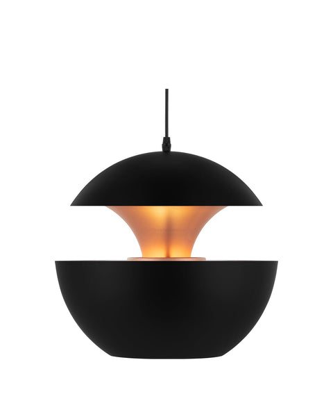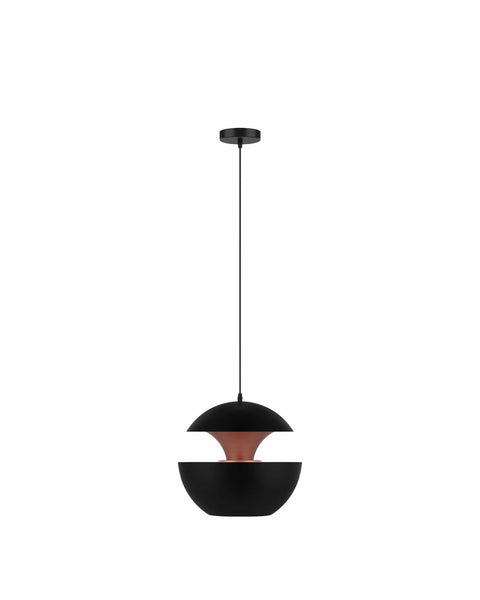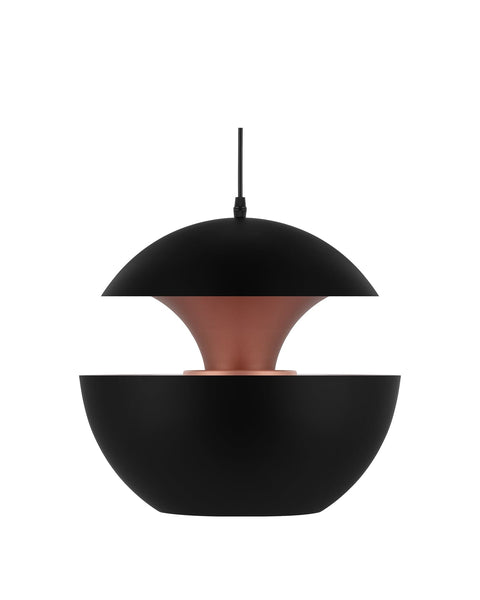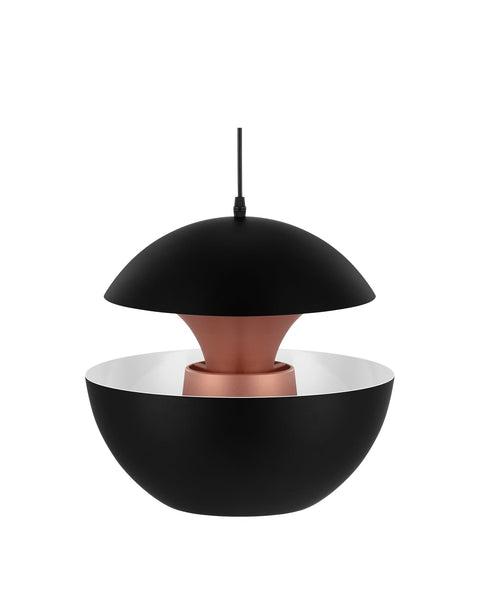 Resembling a delicate sphere suspended in air, the Omena Pendant Light captivates with its understated yet captivating design. Its outer shell, made of lacquered aluminum, boasts a sleek and modern appearance, while the inner surface, coated in a reflective copper finish, diffuses light in a soft and gentle manner.