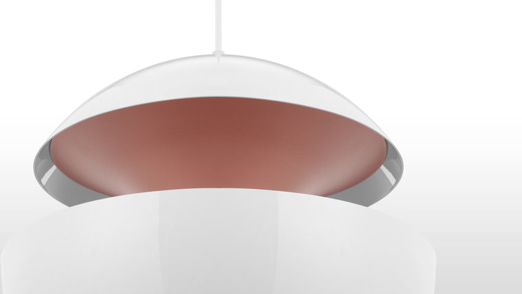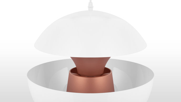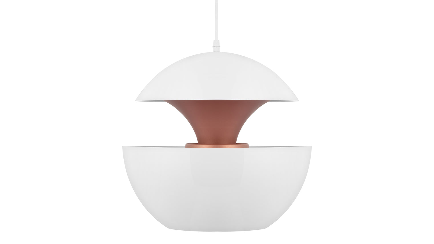 Resembling a delicate sphere suspended in air, the Omena Pendant Light captivates with its understated yet captivating design. Its outer shell, made of lacquered aluminum, boasts a sleek and modern appearance, while the inner surface, coated in a reflective copper finish, diffuses light in a soft and gentle manner.