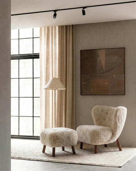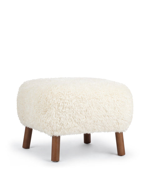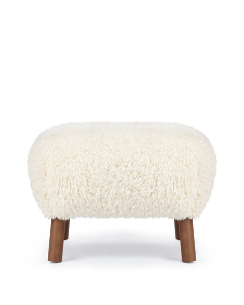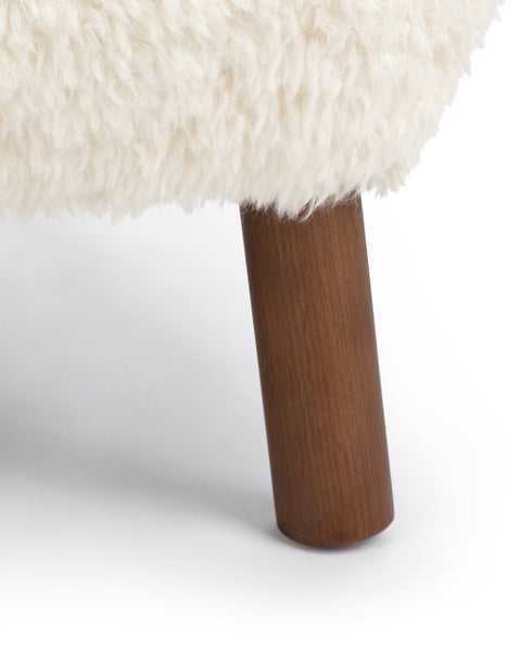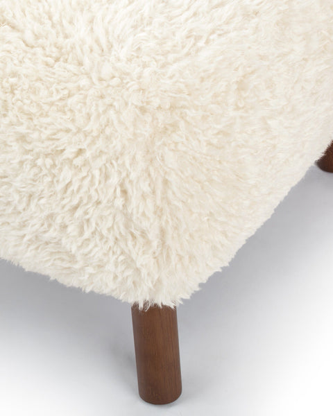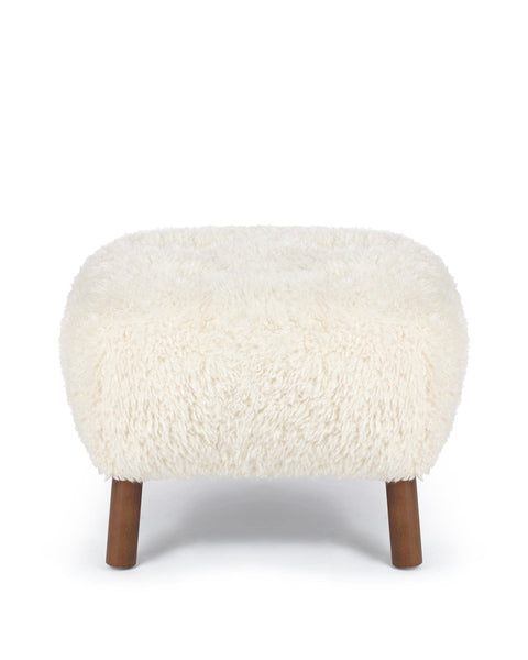 An extension of the Petra lounge chair, the Petra Ottoman embodies the same stylish character and stunningly compact design. Its plush cushion is upholstered in white long hair sherpa, offering a sumptuously soft and cozy feel. The luxurious upholstery not only adds warmth but also brings a touch of nature indoors, creating a harmonious atmosphere.