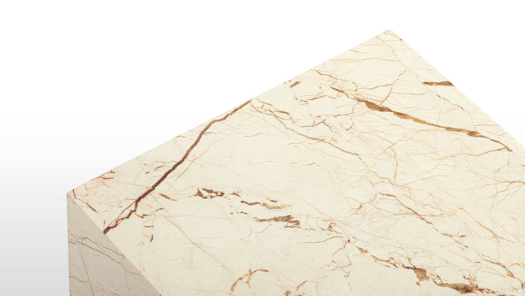 Perfectly uniform in shape, this monolithic design is an homage to the exquisite natural character of the stone. Made from premium sofita gold marble with striking, elegant veining, each Plinth coffee will be unique, bearing the distinctive characteristics that were rendered into this beautiful stone over hundreds of years.