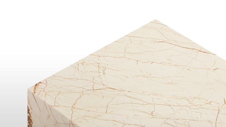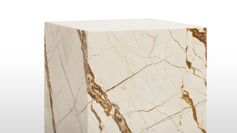Perfectly uniform in shape, this monolithic design is an homage to the exquisite natural character of the stone. Made from premium sofita gold marble with striking, elegant veining, each Plinth coffee will be unique, bearing the distinctive characteristics that were rendered into this beautiful stone over hundreds of years.