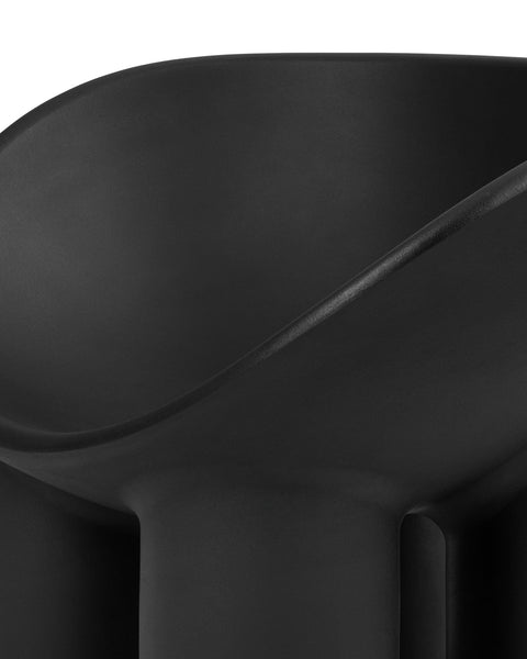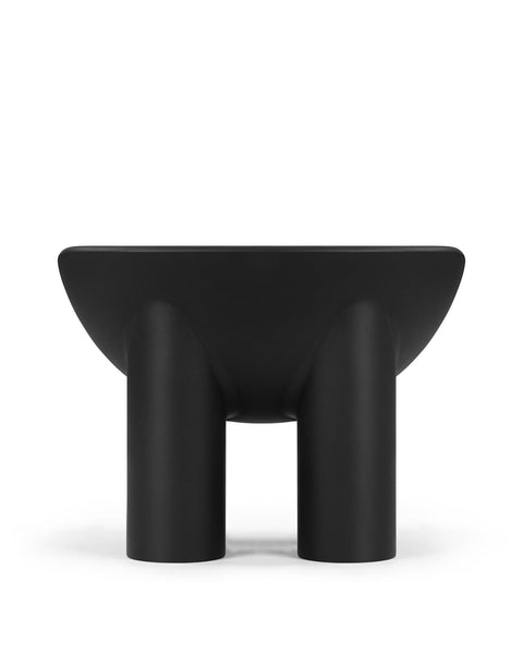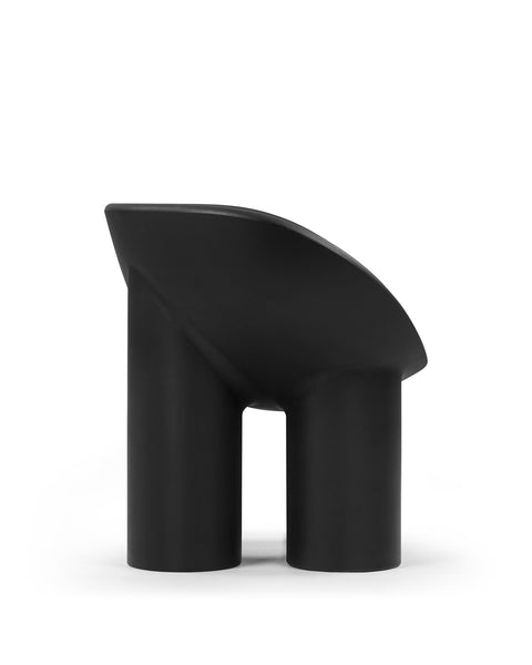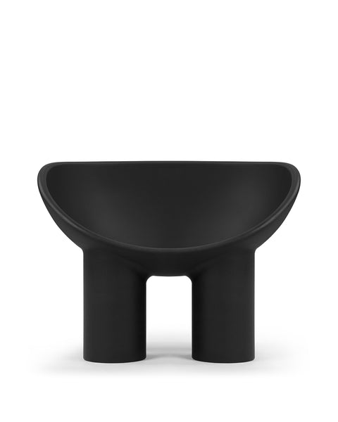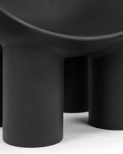 The Roly Poly chair is a distinctive piece of furniture that exemplifies modern aesthetics and comfort through its sculptural form. It is immediately recognizable due to its unique, rounded silhouette. It features a deep, bowl-like seat that appears to be carved out of a solid block, creating a cocooning effect that invites the user to sit back and relax. The chair's thick, robust legs provide a sturdy base, contrasting with the soft curves of the seat. This combination of geometric and organic forms gives the Roly Poly chair its distinctive character.