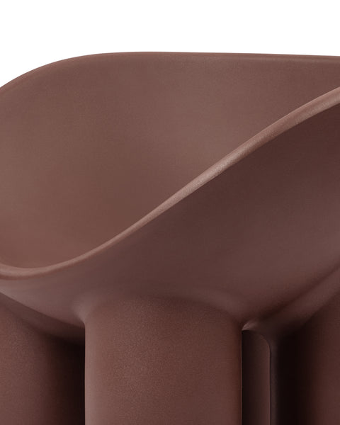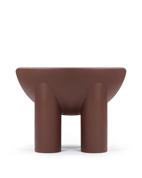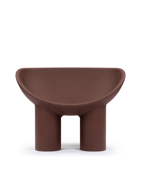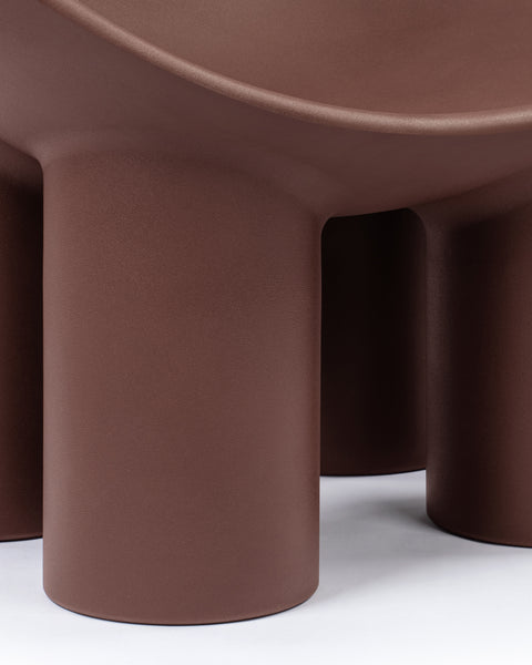 The Roly Poly chair is a distinctive piece of furniture that exemplifies modern aesthetics and comfort through its sculptural form. It is immediately recognizable due to its unique, rounded silhouette. It features a deep, bowl-like seat that appears to be carved out of a solid block, creating a cocooning effect that invites the user to sit back and relax. The chair's thick, robust legs provide a sturdy base, contrasting with the soft curves of the seat. This combination of geometric and organic forms gives the Roly Poly chair its distinctive character.