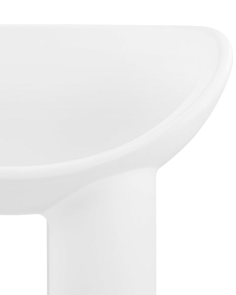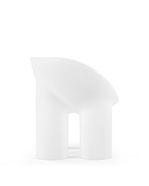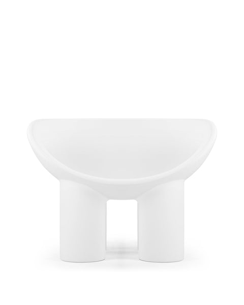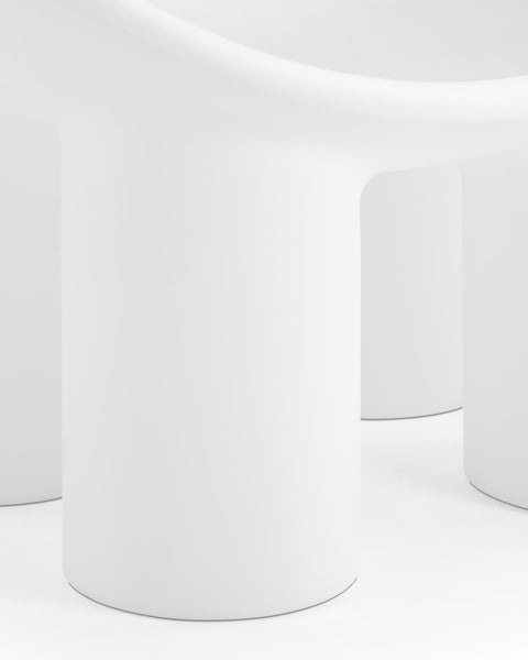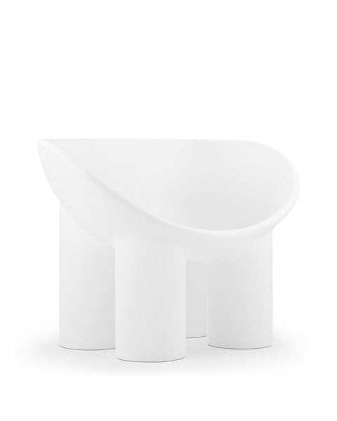 The Roly Poly chair is a distinctive piece of furniture that exemplifies modern aesthetics and comfort through its sculptural form. It is immediately recognizable due to its unique, rounded silhouette. It features a deep, bowl-like seat that appears to be carved out of a solid block, creating a cocooning effect that invites the user to sit back and relax. The chair's thick, robust legs provide a sturdy base, contrasting with the soft curves of the seat. This combination of geometric and organic forms gives the Roly Poly chair its distinctive character.