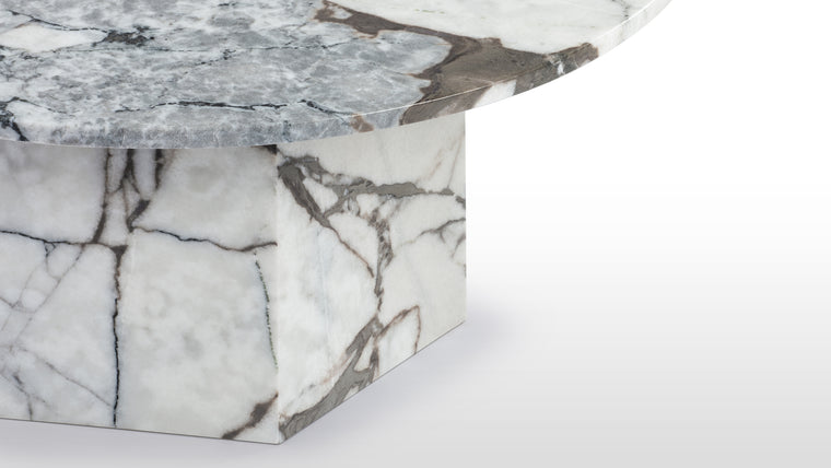 Inspired by Roman architecture, but designed with contemporary flair, the Saga Coffee Table is an eye-catching and versatile modern piece. The smooth marble or stone top is offset by the angular plinth base, coming together for a design which is minimalistic in principle yet undeniably striking. Its unfussy monolithic form emphasizes the materiality of stone: its vibrant texture, unique patina, characterful veining, and subtle variations in color. The honed table-top provides both a stylish and practical surface for dining, working, and gathering. Please be aware that as it is made from natural stone, each marble table will be slightly different in appearance, and have the natural characteristics of the stone: colour variation, natural veining, and pores.