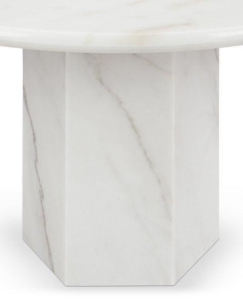 Inspired by Roman architecture, but designed with contemporary flair, the Saga dining table is an eye-catching and versatile modern piece. The smooth marble top is offset by the angular plinth base, coming together for a design which is minimalistic in principle yet undeniably striking. Its unfussy monolithic form emphasizes the materiality of stone: its vibrant texture, unique patina, characterful veining, and subtle variations in color. The polished table-top provides both a stylish and practical surface for dining, working, and gathering. Please be aware that as it is made from natural stone, each marble table will be slightly different in appearance, and have the natural characteristics of the stone: color variation, natural veining, and pores.