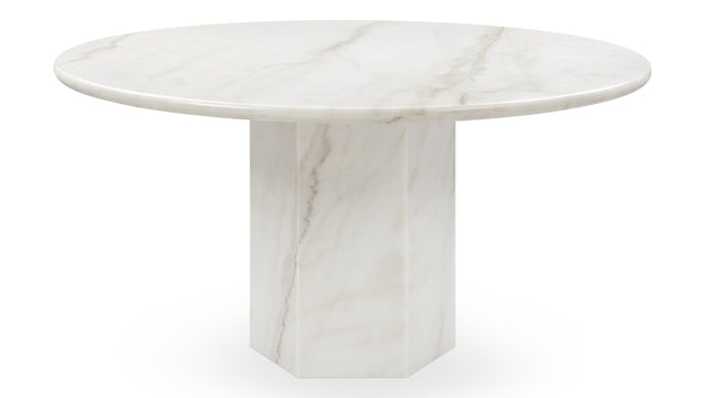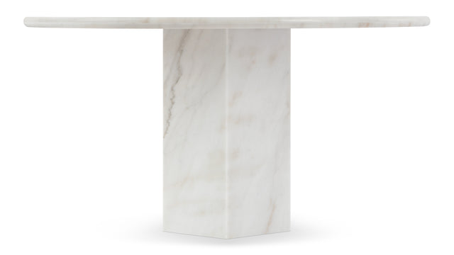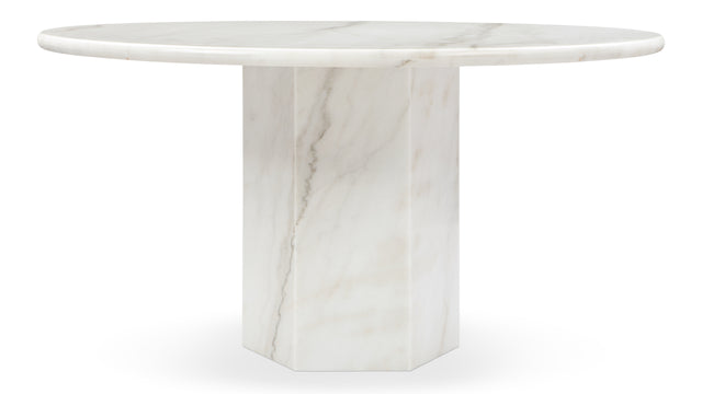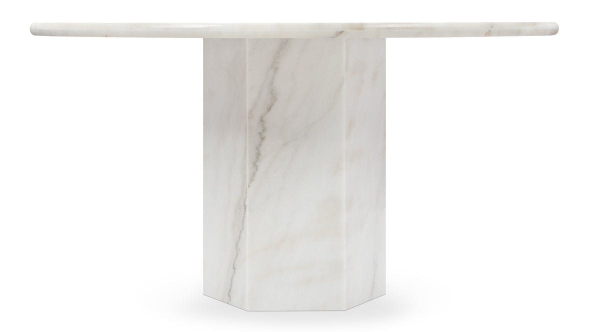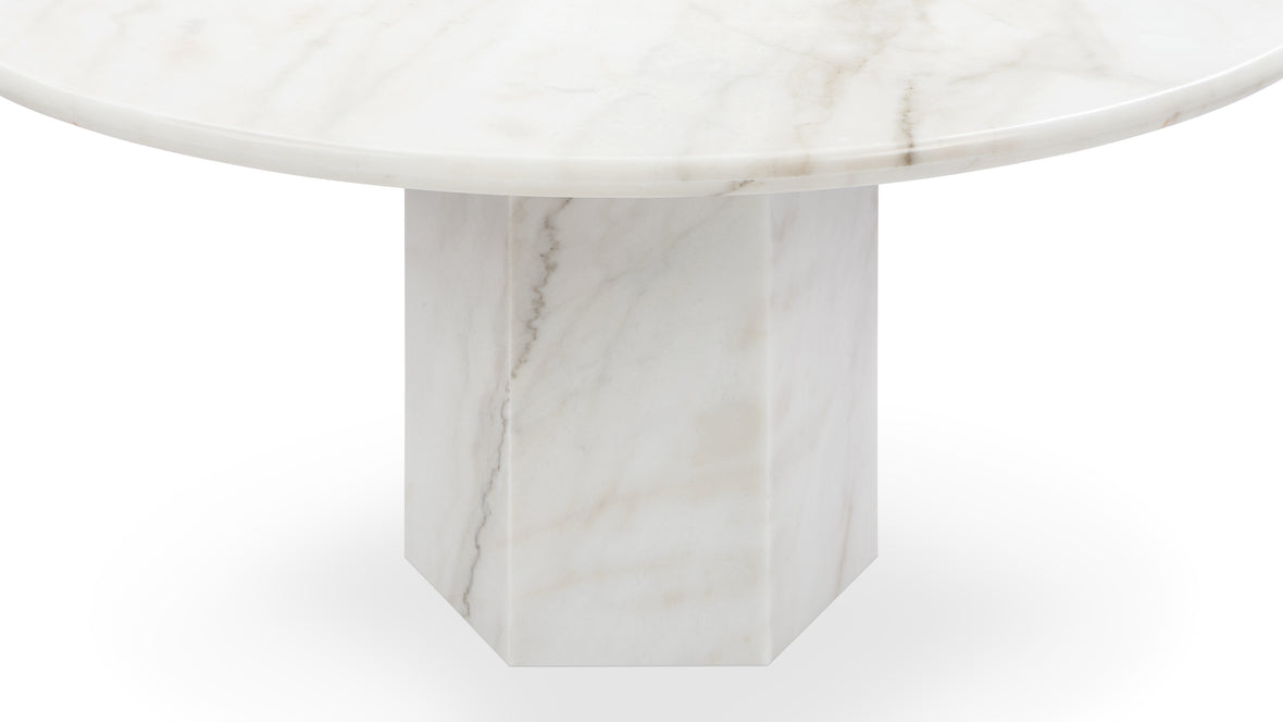 Inspired by Roman architecture, but designed with contemporary flair, the Saga dining table is an eye-catching and versatile modern piece. The smooth marble top is offset by the angular plinth base, coming together for a design which is minimalistic in principle yet undeniably striking. Its unfussy monolithic form emphasizes the materiality of stone: its vibrant texture, unique patina, characterful veining, and subtle variations in color. The polished table-top provides both a stylish and practical surface for dining, working, and gathering. Please be aware that as it is made from natural stone, each marble table will be slightly different in appearance, and have the natural characteristics of the stone: color variation, natural veining, and pores.