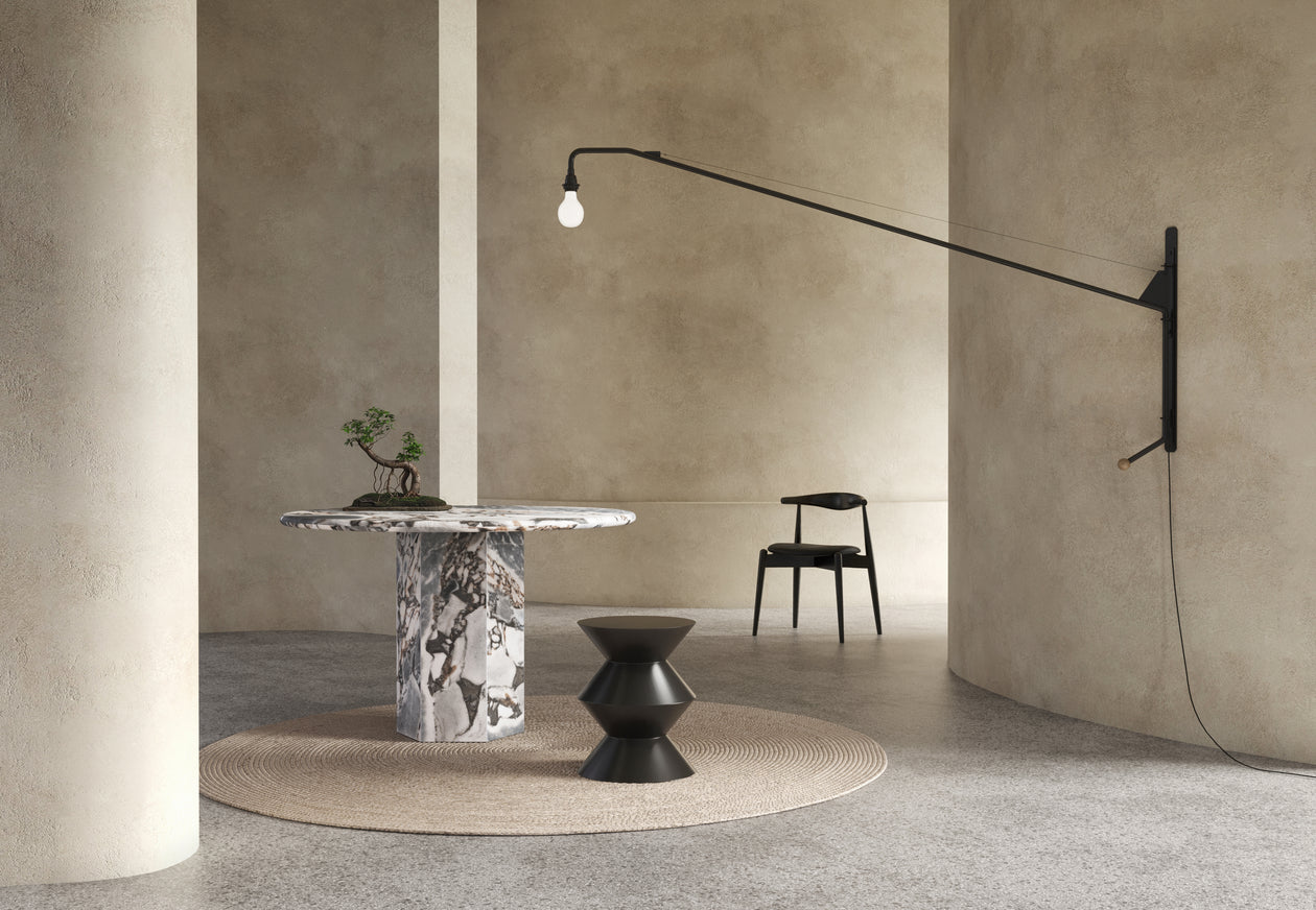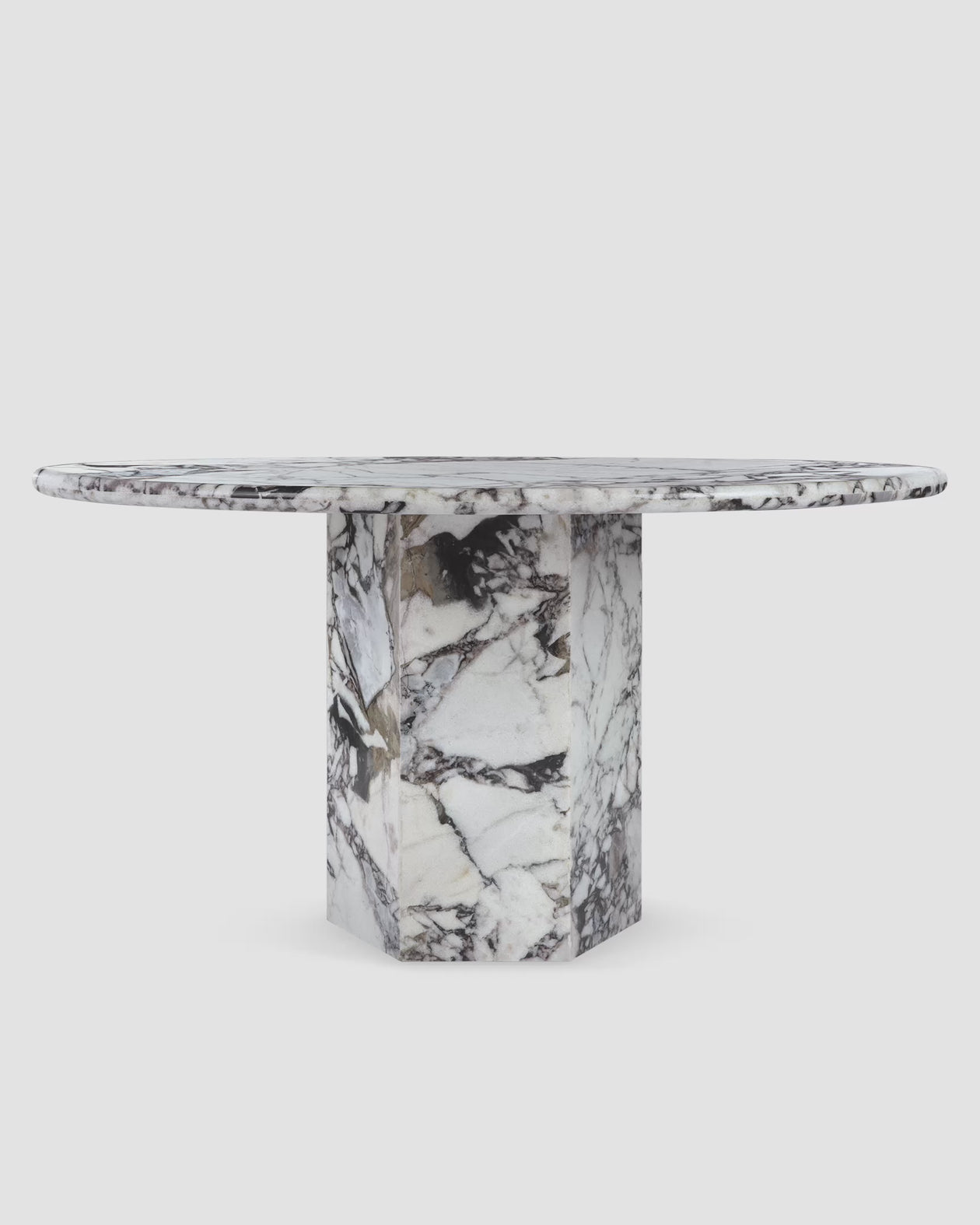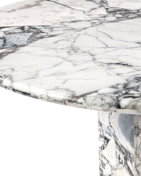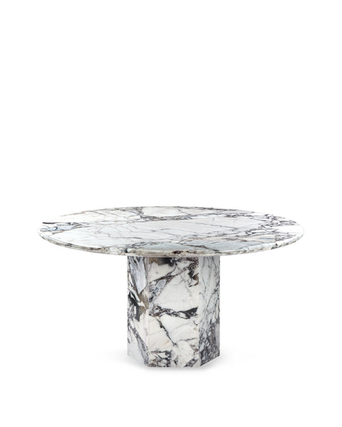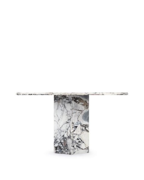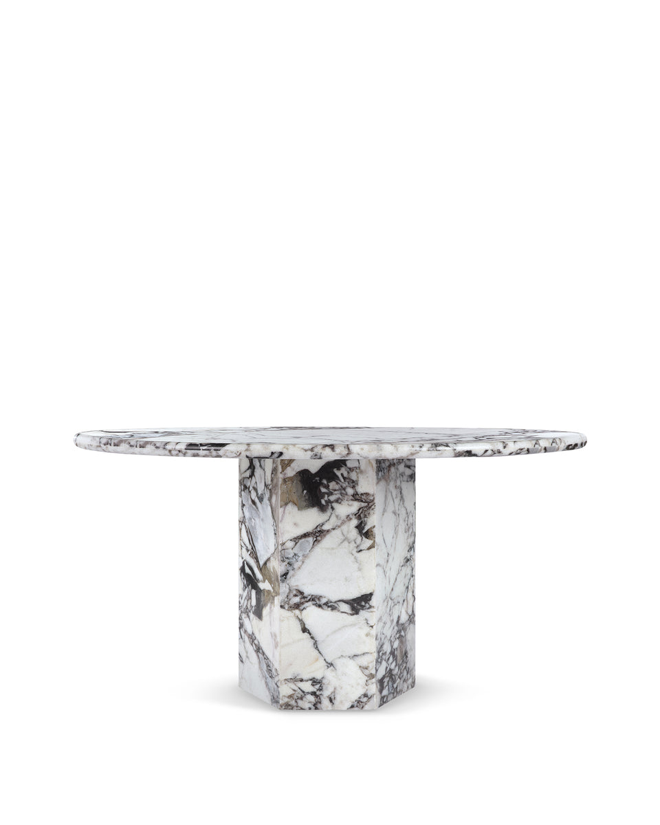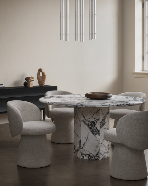 Inspired by Roman architecture, but designed with contemporary flair, the Saga dining table is an eye-catching and versatile modern piece. The smooth marble top is offset by the angular plinth base, coming together for a design which is minimalistic in principle yet undeniably striking. Its unfussy monolithic form emphasizes the materiality of stone: its vibrant texture, unique patina, characterful veining, and subtle variations in color. The honed table-top provides both a stylish and practical surface for dining, working, and gathering. Please be aware that as it is made from natural stone, each marble table will be slightly different in appearance, and have the natural characteristics of the stone: colour variation, natural veining, and pores.