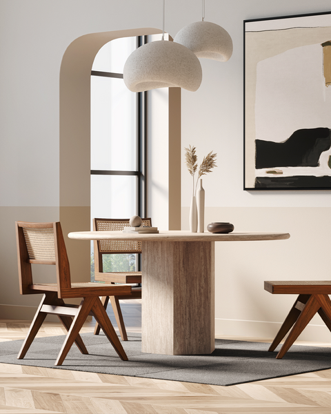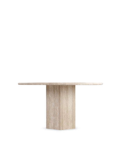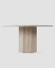 Inspired by Roman architecture, but designed with contemporary flair, the Saga dining table is an eye-catching and versatile modern piece. The smooth marble top is offset by the angular plinth base, coming together for a design which is minimalistic in principle yet undeniably striking. Its unfussy monolithic form emphasizes the materiality of stone: its vibrant texture, unique patina, characterful veining, and subtle variations in color. The honed table-top provides both a stylish and practical surface for dining, working, and gathering. Please be aware that as it is made from natural stone, each marble table will be slightly different in appearance, and have the natural characteristics of the stone: colour variation, natural veining, and pores.