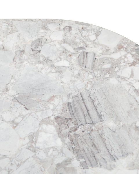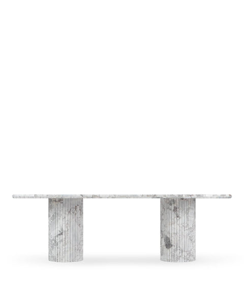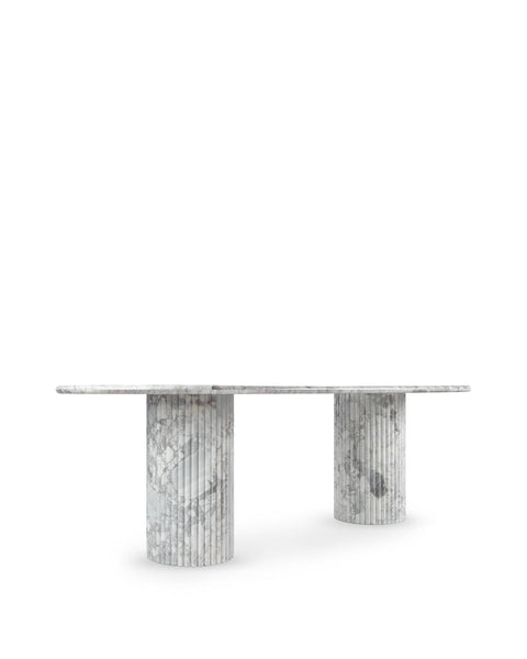 Subtly referencing the grandeur of classical architecture, the Saturn travertine dining table is a contemporary take on traditional design. The smooth, polished marble top is offset by the textural reeded pillar bases, coming together for a design which is minimalist in theory but interesting to the eye. Orso Grigio marble is a beautiful natural Italian stone which has been used in high-end design for centuries. The polished table-top provides both a stylish and practical surface for dining, working, and gathering. Please be aware that as it is made from natural stone, each marble table will be slightly difference in appearance, and have the natural characteristics of the stone: color variation, natural veining, and pores.