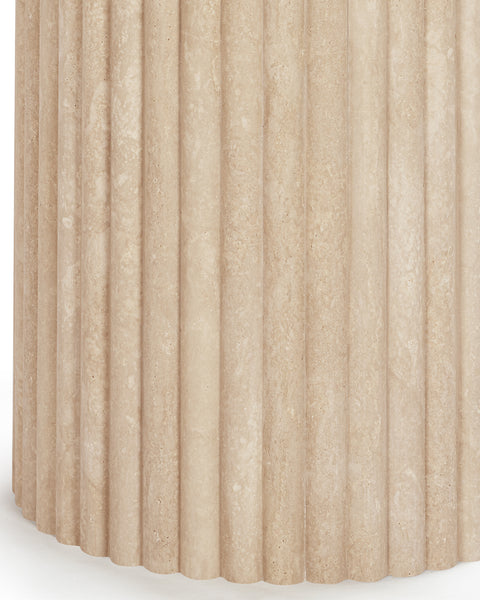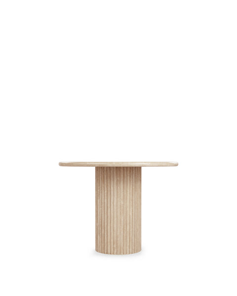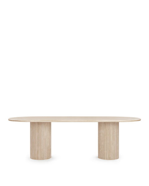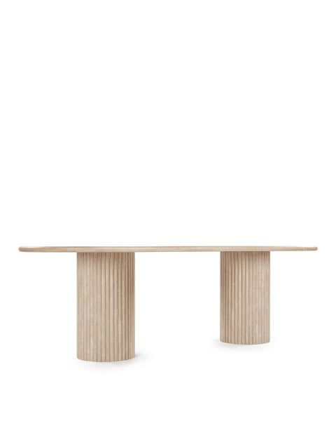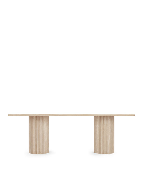 Subtly referencing the grandeur of classical architecture, the Saturn travertine dining table is a contemporary take on traditional design. The smooth, honed travertine top is offset by the textural reeded pillar bases, coming together for a design which is minimalist in theory but interesting to the eye. Surprisingly warm in tone and aesthetics, travertine is a beautiful natural Italian stone which has been used in high-end design for centuries. The honed table-top provides both a stylish and practical surface for dining, working, and gathering. Please be aware that as it is made from natural stone, each travertine table will be slightly difference in appearance, and have the natural characteristics of the stone: colour variation, natural veining, and pours.
