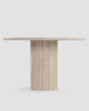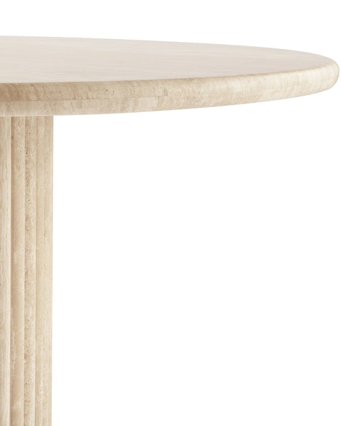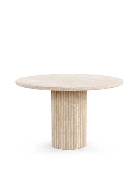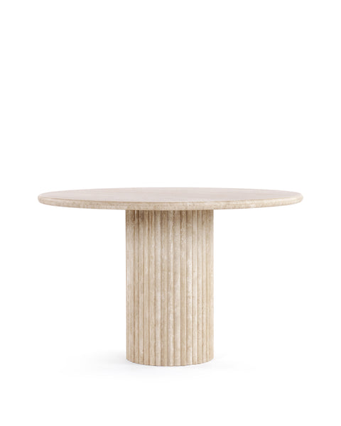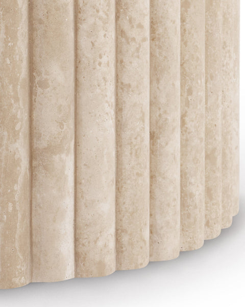 Subtly referencing the grandeur of classical architecture, the Saturn travertine dining table is a contemporary take on traditional design. The smooth, honed travertine top is offset by the textural reeded pillar base, coming together for a design which is minimalist in theory but interesting to the eye. Surprisingly warm in tone and aesthetics, travertine is a beautiful natural Italian stone which has been used in high-end design for centuries. The honed table-top provides both a stylish and practical surface for dining, working, and gathering. Please be aware that as it is made from natural stone, each travertine table will be slightly difference in appearance, and have the natural characteristics of the stone: colour variation, natural veining, and pours.