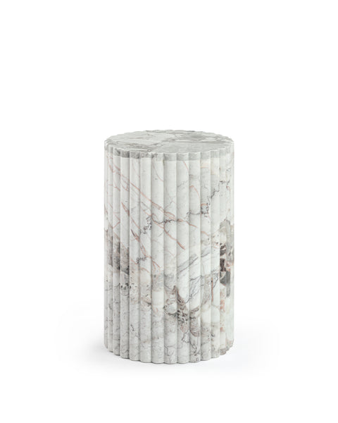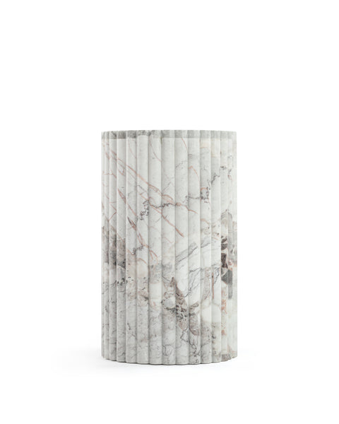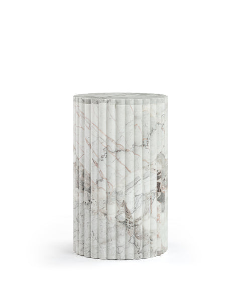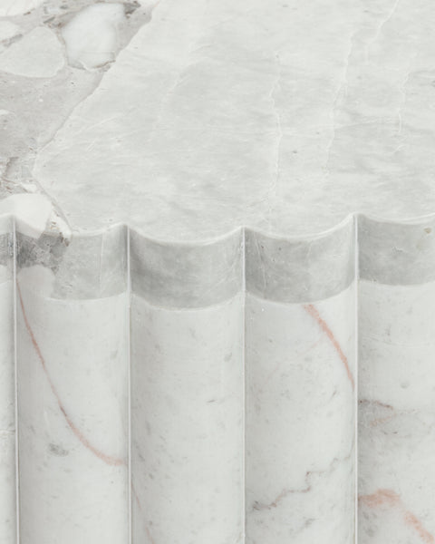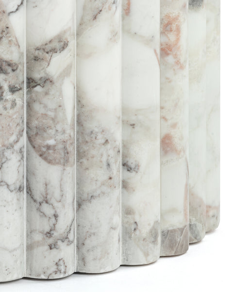 Subtly referencing the grandeur of classical architecture, the Saturn travertine dining table is a contemporary take on traditional design. The smooth, polished marble top is offset by the textural reeded pillar bases, coming together for a design which is minimalist in theory but interesting to the eye. Surprisingly warm in tone and aesthetics, Dark Emperador marble is a beautiful natural Italian stone which has been used in high-end design for centuries. The polished table-top provides both a stylish and practical surface for dining, working, and gathering. Please be aware that as it is made from natural stone, each marble table will be slightly difference in appearance, and have the natural characteristics of the stone: colour variation, natural veining, and pores.